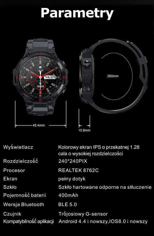 - Smartwatch jest kompatybilny z Android 4.4 i nowszy, iOS 8.0 i nowszy.