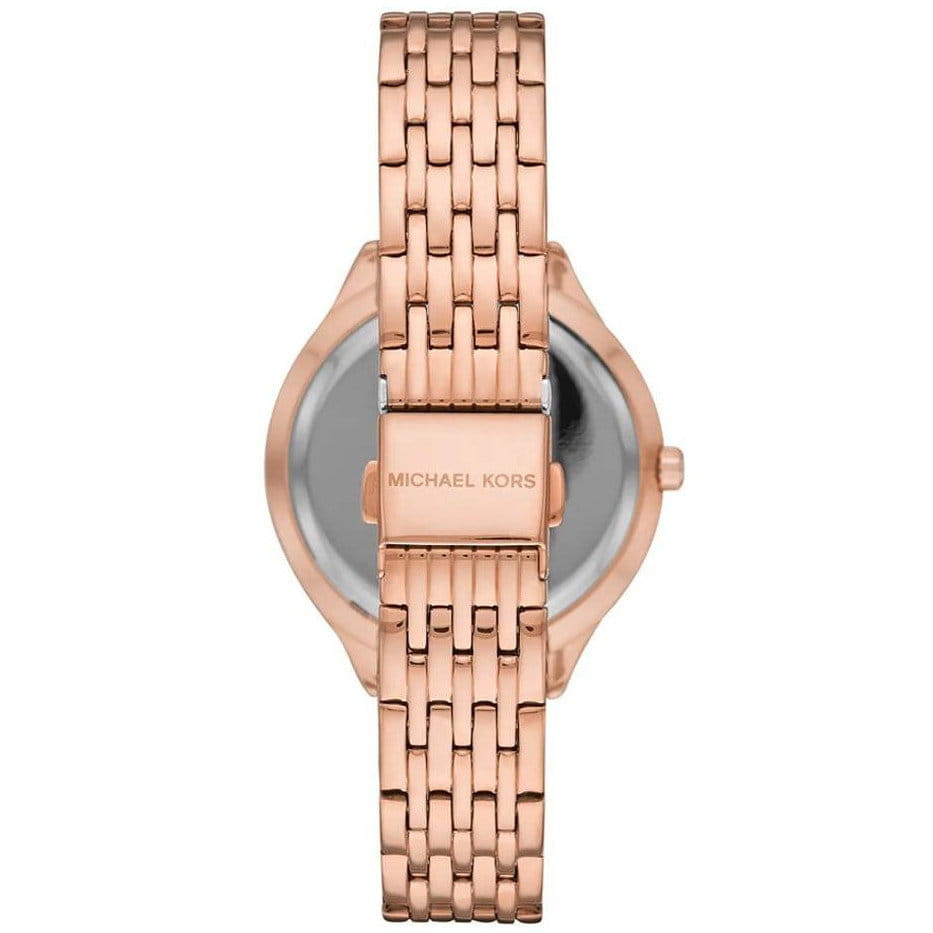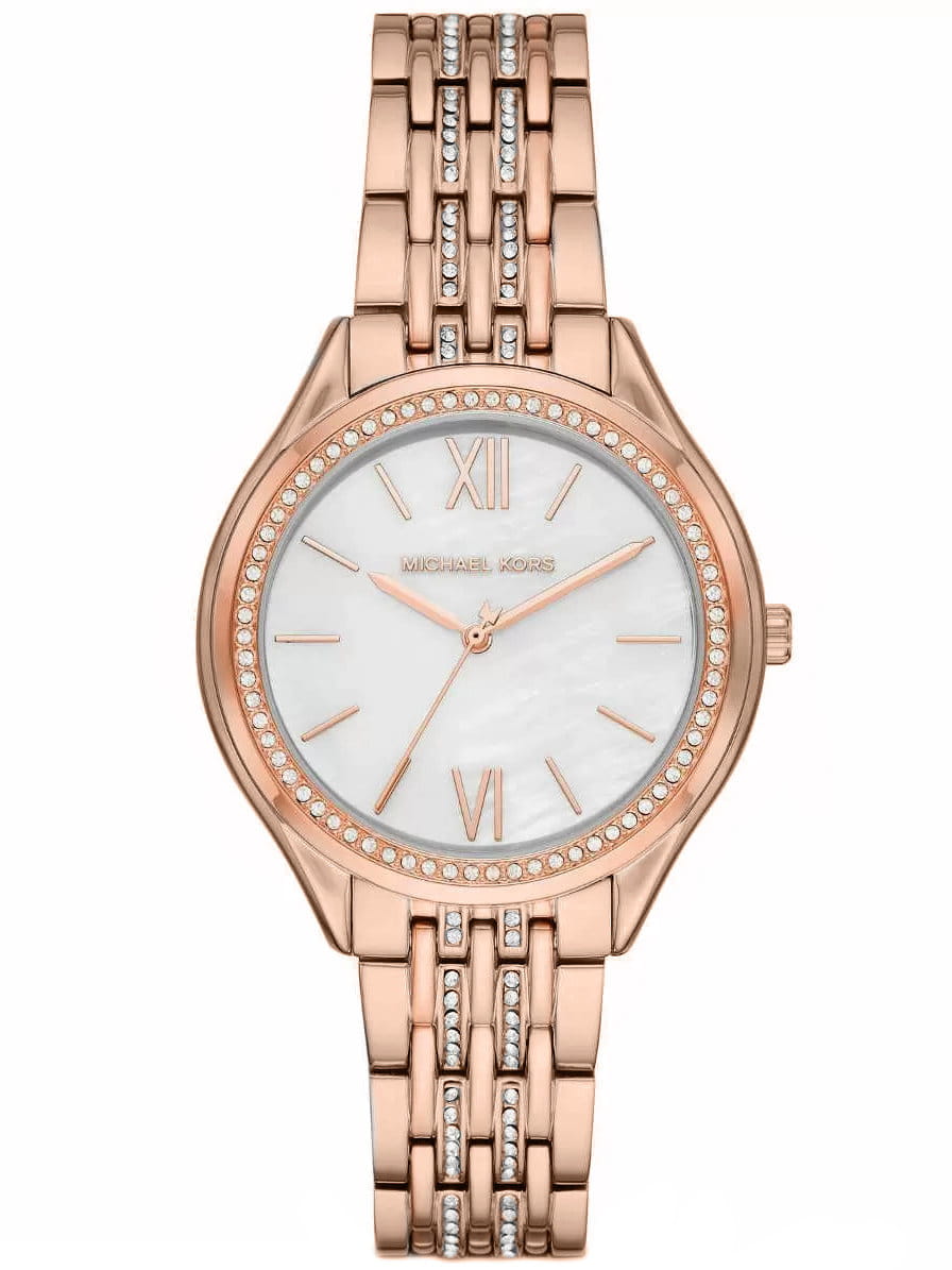 Zegarek Michael Kors MK7076 to stylowy damski zegarek. Koperta oraz bransoleta w kolorze różowe złota zostały wykonane ze stali szlachetnej co gwarantuje wieloletnią odporność na zniszczenie. Cyrkonie na obręczy oraz bransolecie uzupełniają całość.