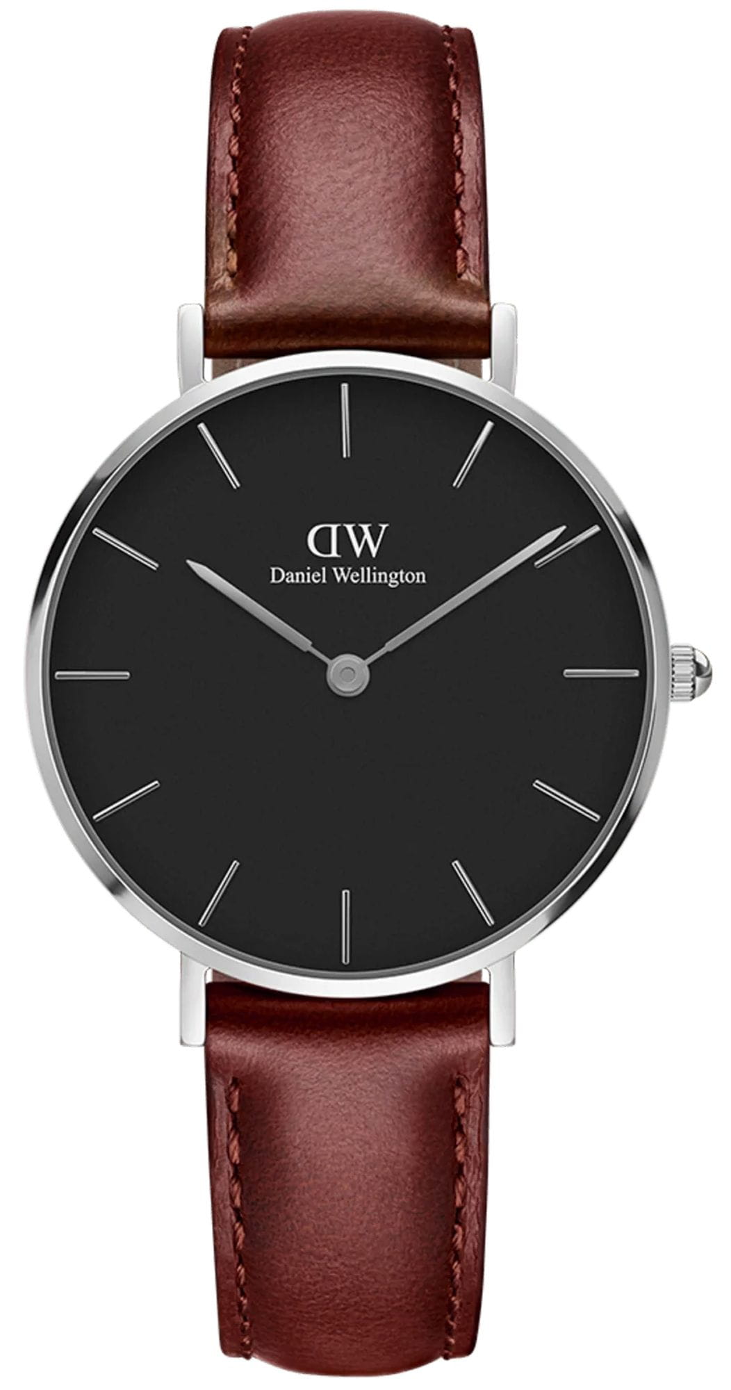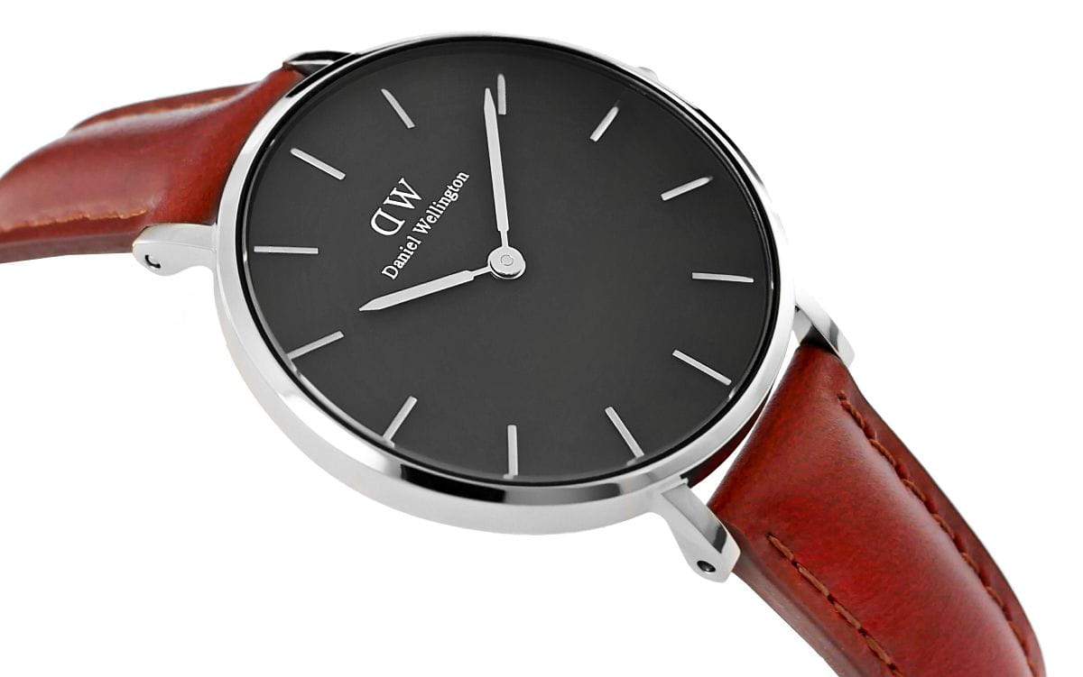 Zegarek Daniel Wellington DW00100181 wyróżnia się elegancką czarną tarczą, która tworzy wyjątkowy kontrast z brązowym skórzanym paskiem.