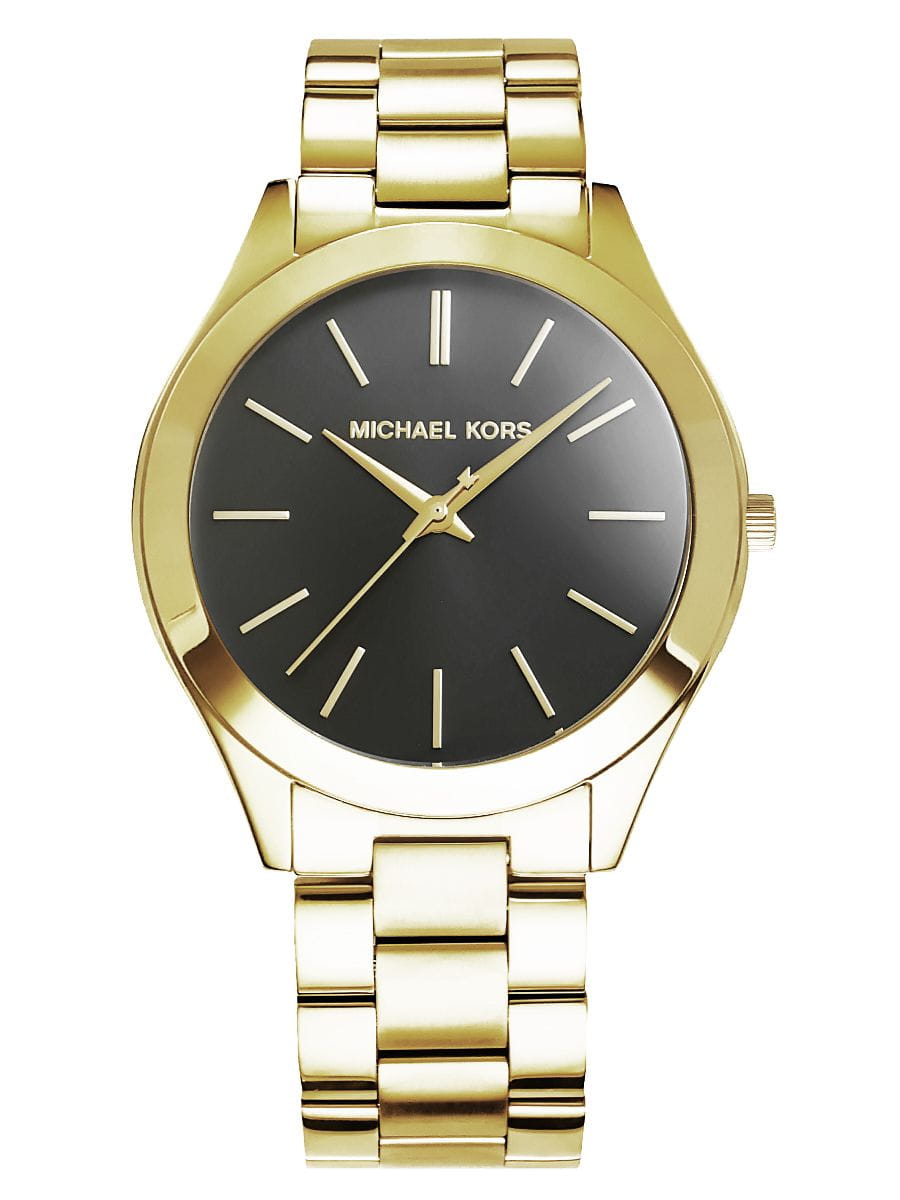 Tarcza: Czarna tarcza z wyraźnymi złotymi indeksami godzinowymi i logo Michael Kors.