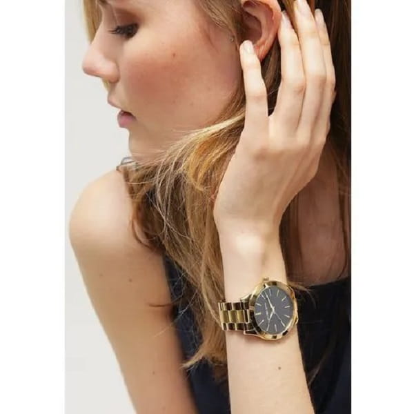 Ten model wyróżnia się eleganckim złotym wykończeniem i kontrastową czarną tarczą, dodając blasku i wyrafinowania każdej stylizacji.