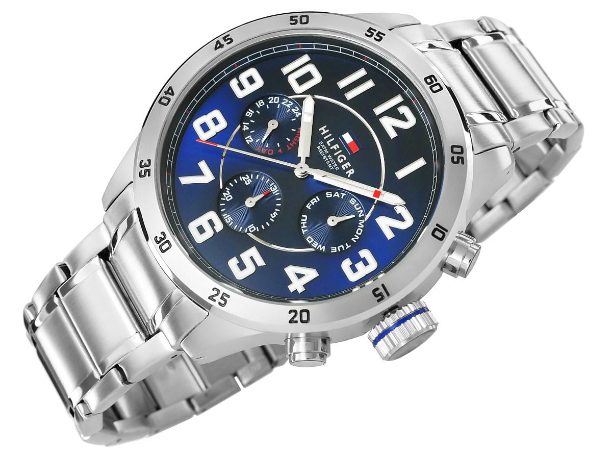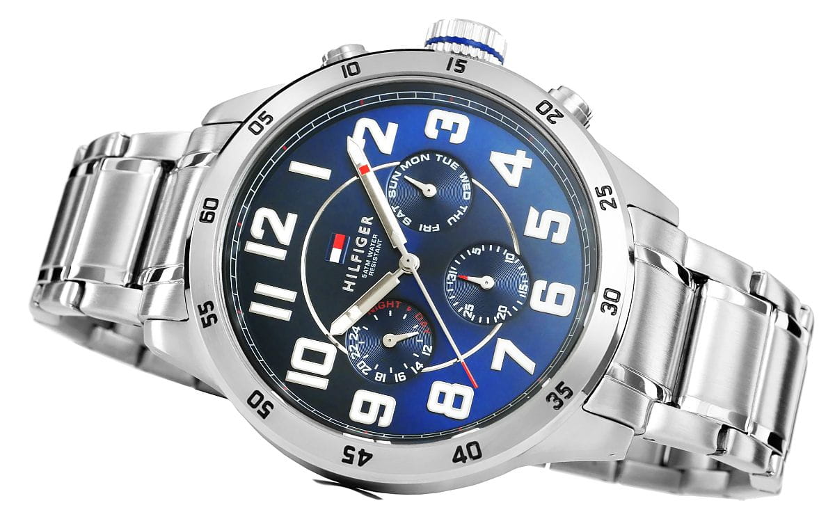 - Tarcza: Analogowa z chronografami dni tygodnia i miesiąca oraz 24h