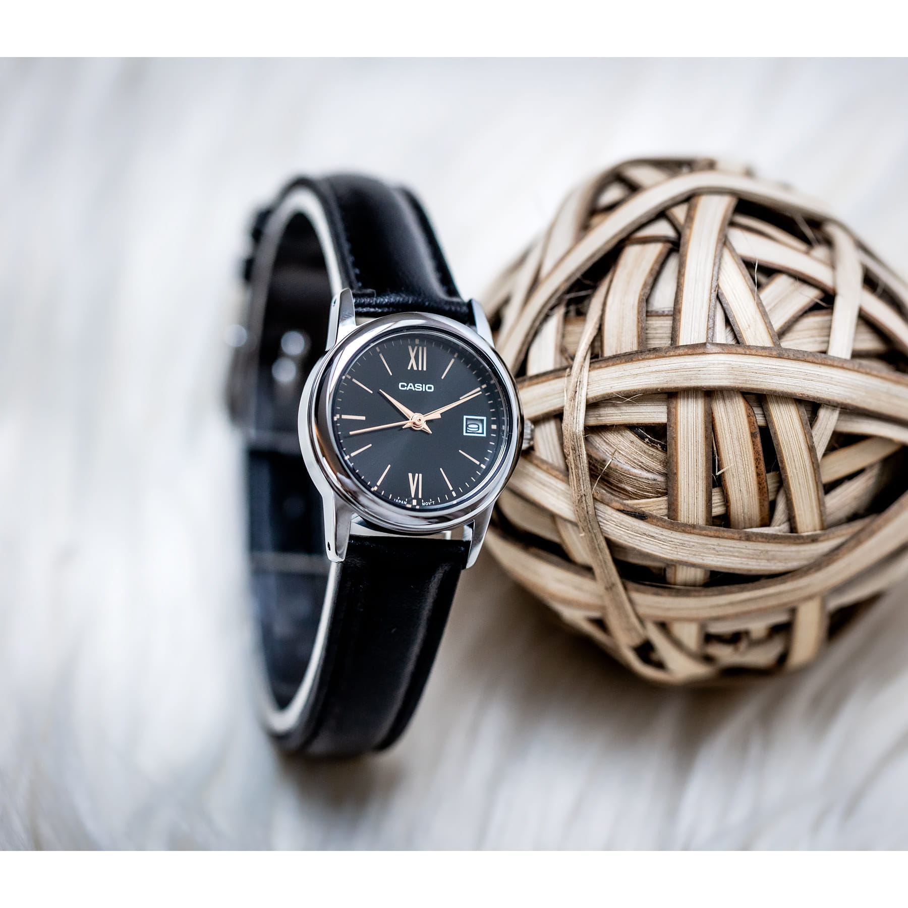 Czarna tarcza zegarka Casio LTP-V002L-1B3UDF emanuje prostotą i klasą. Zastosowanie jasnych indeksów oraz smukłych srebrnych wskazówek zapewnia doskonałą czytelność i elegancki kontrast. Minimalistyczne oznaczenia godzin podkreślają harmonię projektu, a niewielki datownik umieszczony przy godzinie trzeciej dodaje funkcjonalności, pozwalając na szybki odczyt dnia miesiąca. Całość tworzy ponadczasowy wygląd, który nigdy nie wychodzi z mody.