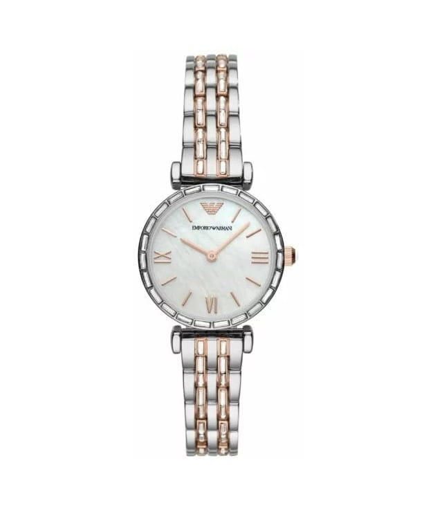 Damski zegarek Emporio Armani AR290 to stylowy damski zegarek idealny zarówno na specjalne okazje, jak i do noszenia na co dzień. Koperta oraz bransoleta zostały wykonane ze stali szlachetnej co gwarantuje wieloletnią odporność na zniszczenie. Bransoleta posiada elementy w kolorach srebrnym i różowego złota. Model posiada dokładny mechanizm kwarcowy zasilany baterią. Tarczę w kolorze perłowym z fakturą macicy perłowej zabezpiecza odporne na zarysowania szkło mineralne.