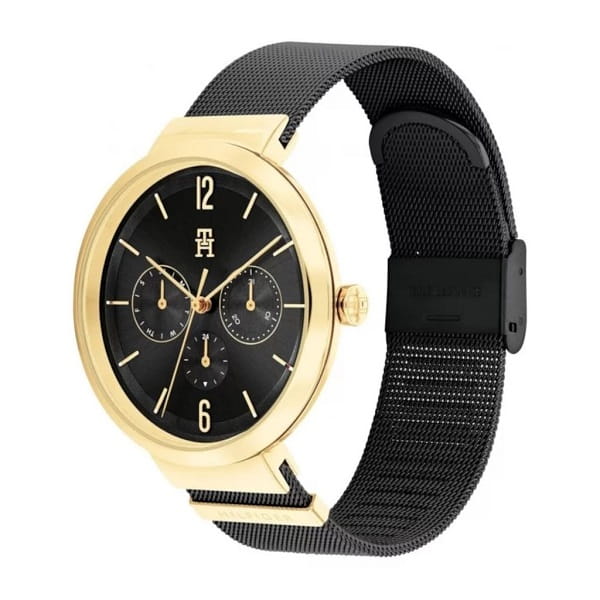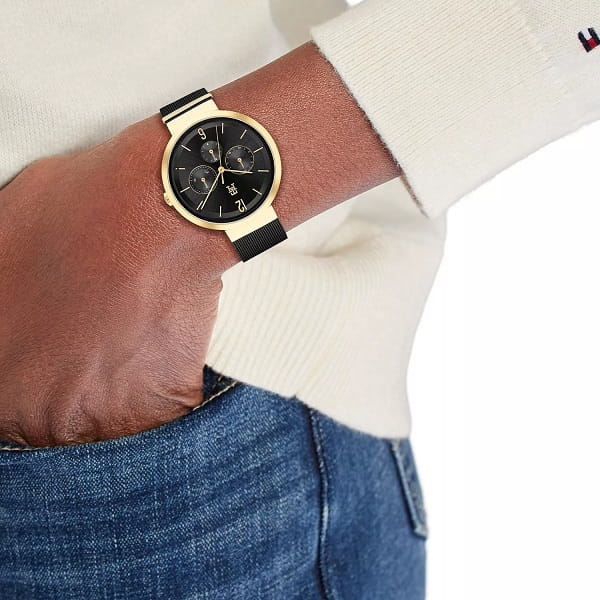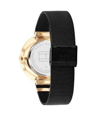 Ten model wyróżnia się stylowym wyglądem, łącząc czarną bransoletę mesh, złotą kopertę i czarną tarczę, co nadaje mu wyjątkowego charakteru.