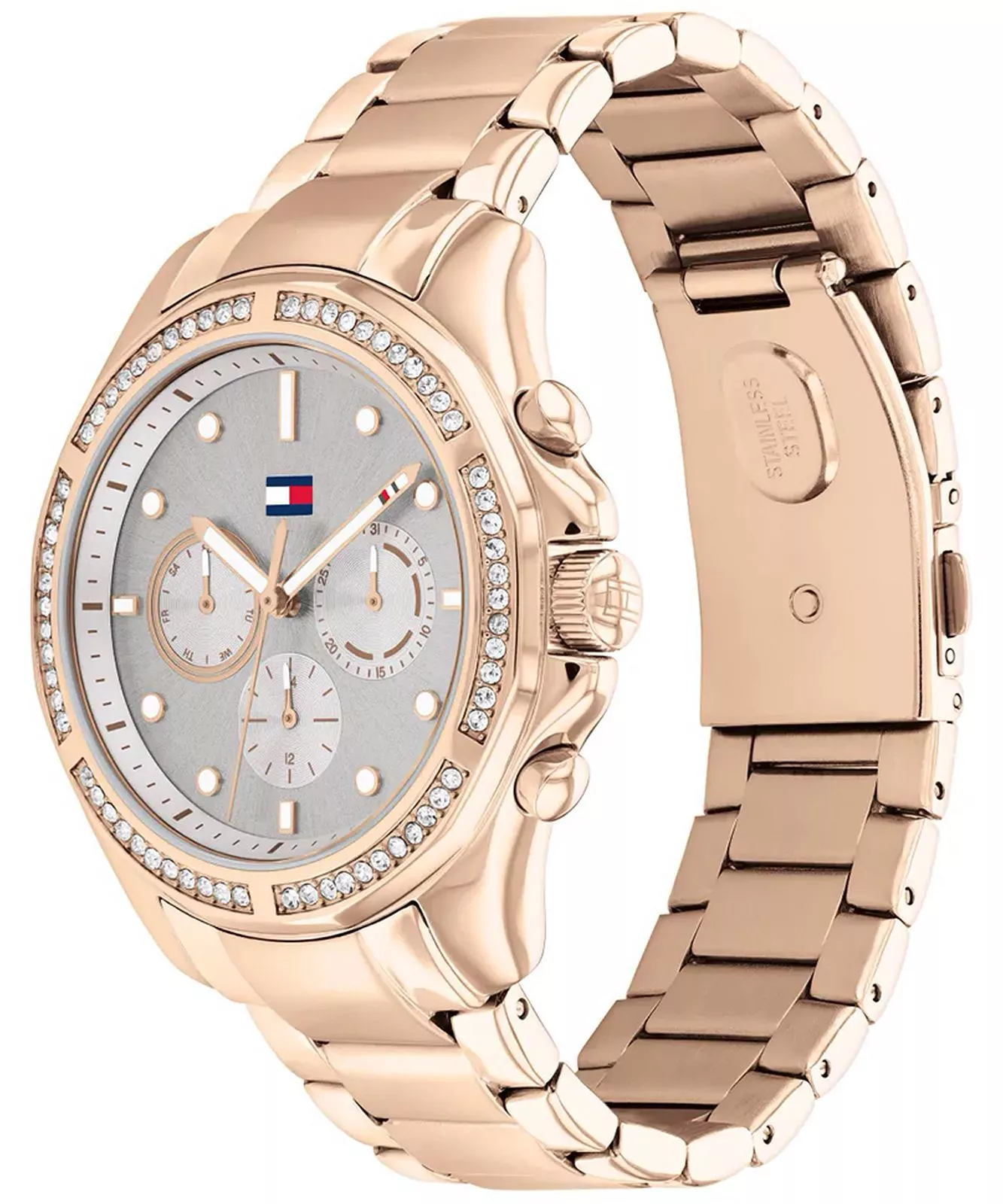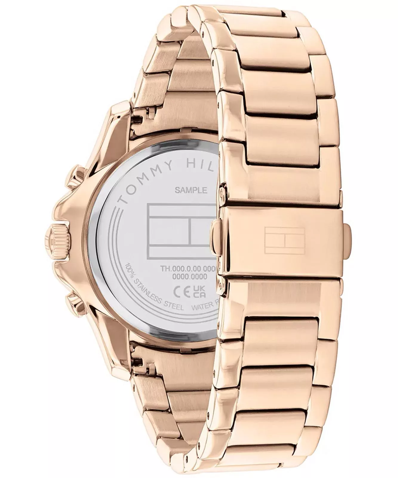 Koperta o średnicy 41 mm i grubości 10 mm została wykonana z wysokiej jakości stali szlachetnej, co zapewnia jej odporność na korozję i uszkodzenia mechaniczne. Jej subtelnie zaokrąglony kształt nadaje zegarkowi klasyczny wygląd, a neutralna szara tarcza doskonale kontrastuje z różowozłotą bransoletą, tworząc wyjątkową kompozycję. Delikatne wskazówki i oznaczenia godzinowe na tarczy podkreślają elegancki charakter tego modelu, a subtelne logo Tommy Hilfiger dodaje mu prestiżowego wyglądu.