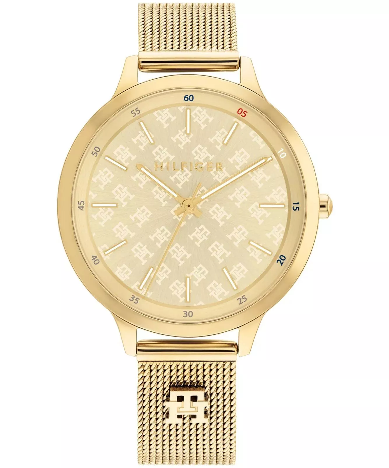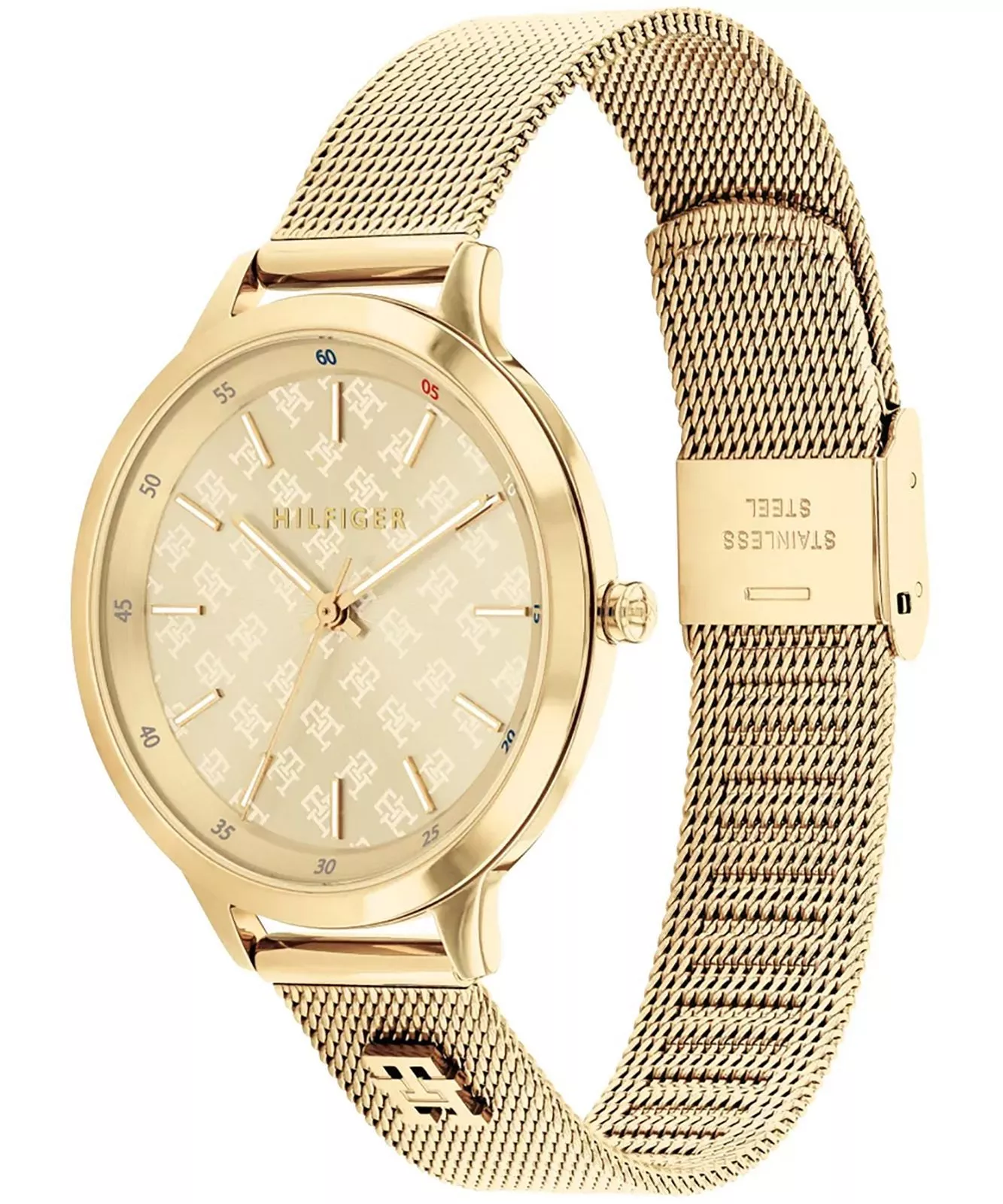 Złota tarcza zachwyca wyjątkowym efektem szlifu słonecznego, który pod wpływem światła tworzy subtelne refleksy, dodając zegarkowi głębi i ekskluzywnego wyglądu. Proste indeksy oraz delikatne wskazówki podkreślają jego minimalistyczny charakter, a umieszczone logo Tommy Hilfiger dodaje mu rozpoznawalności i elegancji. Całość zabezpieczona jest wytrzymałym szkłem mineralnym, odpornym na drobne zarysowania i codzienne użytkowanie.
