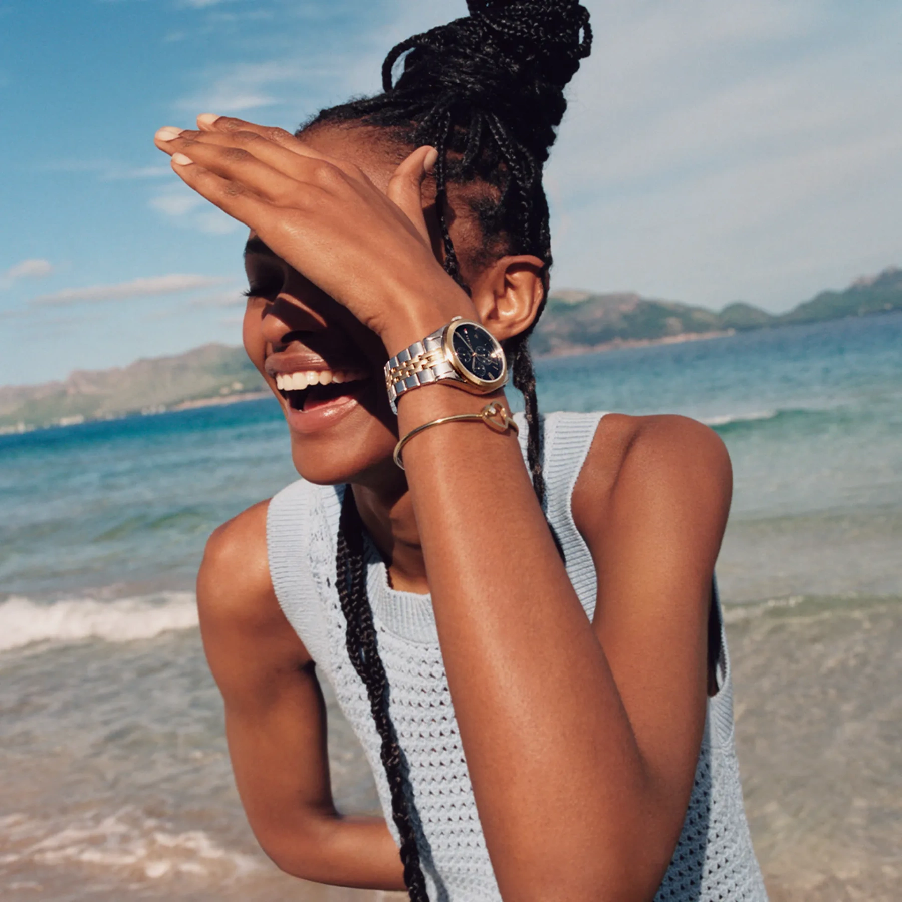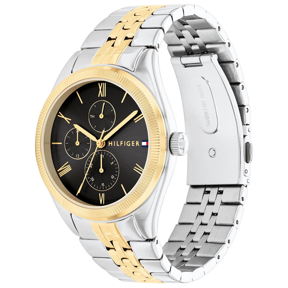 Czarna tarcza zegarka tworzy elegancki kontrast z jasną kopertą i bransoletą, co nadaje całości charakterystycznego wyrazu. Tarcza została zaprojektowana z zachowaniem minimalistycznej estetyki – indeksy i wskazówki są wyraźne, ale nienachalne, a umieszczone subtelnie logo marki Tommy Hilfiger dodaje projektowi rozpoznawalności. Dzięki prostemu układowi elementów, odczyt godziny jest intuicyjny i komfortowy. Szkiełko mineralne, które chroni powierzchnię tarczy, zabezpiecza ją przed przypadkowymi zarysowaniami i drobnymi uszkodzeniami.