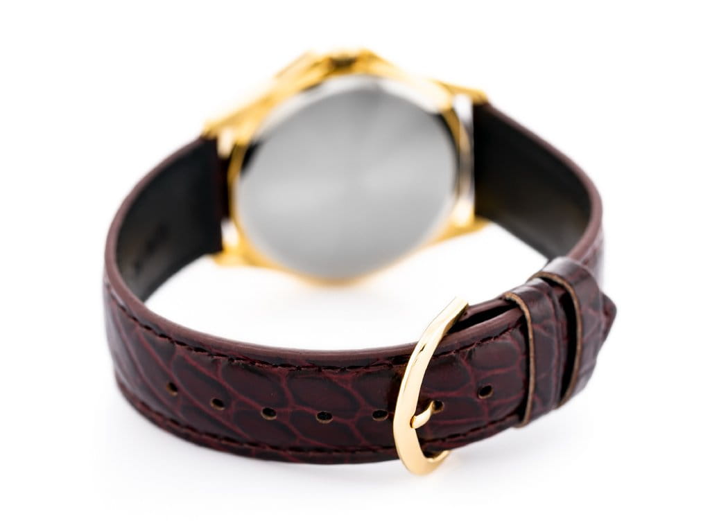 Skórzany pasek w kolorze brązowym zapewnia wygodę noszenia i doskonale komponuje się z całością, podkreślając elegancję i styl użytkownika. Mineralne szkło z powłoką IPS chroni tarczę przed zarysowaniami, zapewniając długotrwałą klarowność.