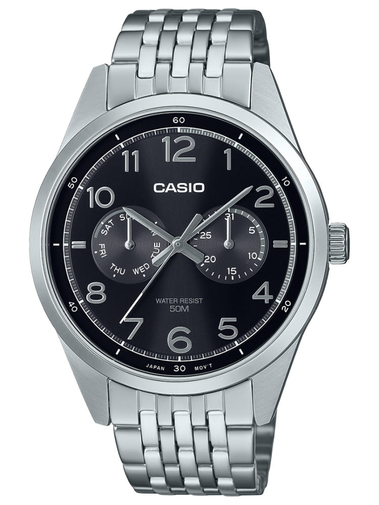 Casio MTP-E340D-1A to model stworzony dla mężczyzn, którzy cenią równowagę między elegancją a nowoczesnością. Jego srebrna bransoleta i czarna tarcza tworzą ponadczasową kombinację kolorystyczną, która doskonale komponuje się z każdą stylizacją – od biurowego garnituru po casualowy zestaw z jeansami. Zegarek nie tylko mierzy czas, ale także podkreśla indywidualny styl i pewność siebie. To idealny towarzysz w pracy, podczas spotkań biznesowych, jak i w czasie wolnym.