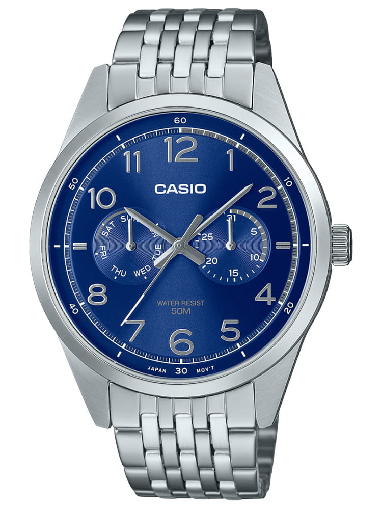 Zegarek męski Casio MTP-E340D-2A to idealne połączenie klasyki i funkcjonalności, stworzone z myślą o mężczyznach, którzy cenią ponadczasowy styl, precyzję oraz wygodę użytkowania. Okrągła koperta ze stali szlachetnej w srebrnym odcieniu nadaje mu eleganckiego charakteru, a granatowa tarcza z subtelnymi srebrnymi indeksami i wskazówkami podkreśla jego nowoczesny design. To model, który zachwyca nie tylko wyglądem, ale także dbałością o detale i funkcjonalnością, dzięki czemu sprawdza się w każdej sytuacji – od codziennego użytku po bardziej formalne okazje.