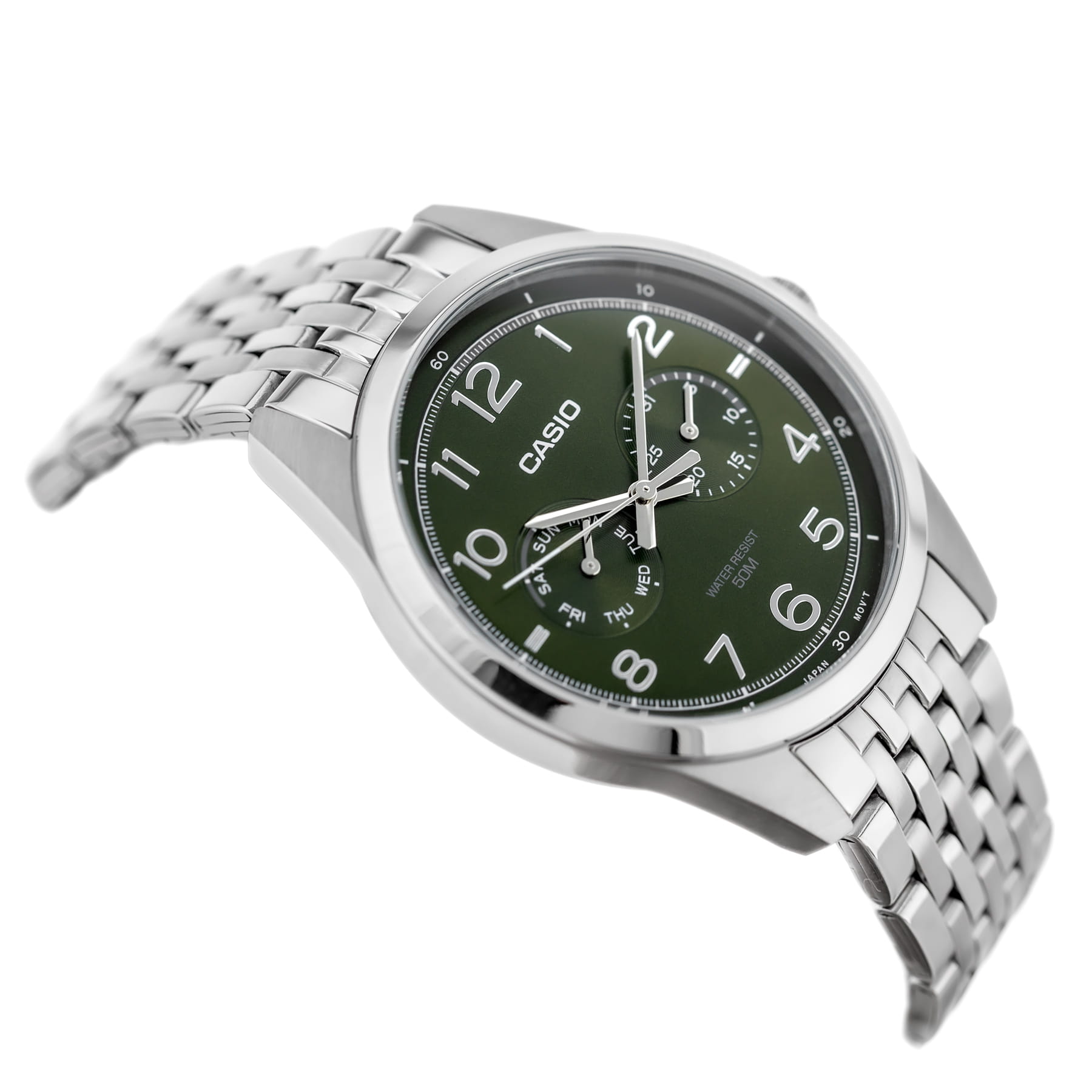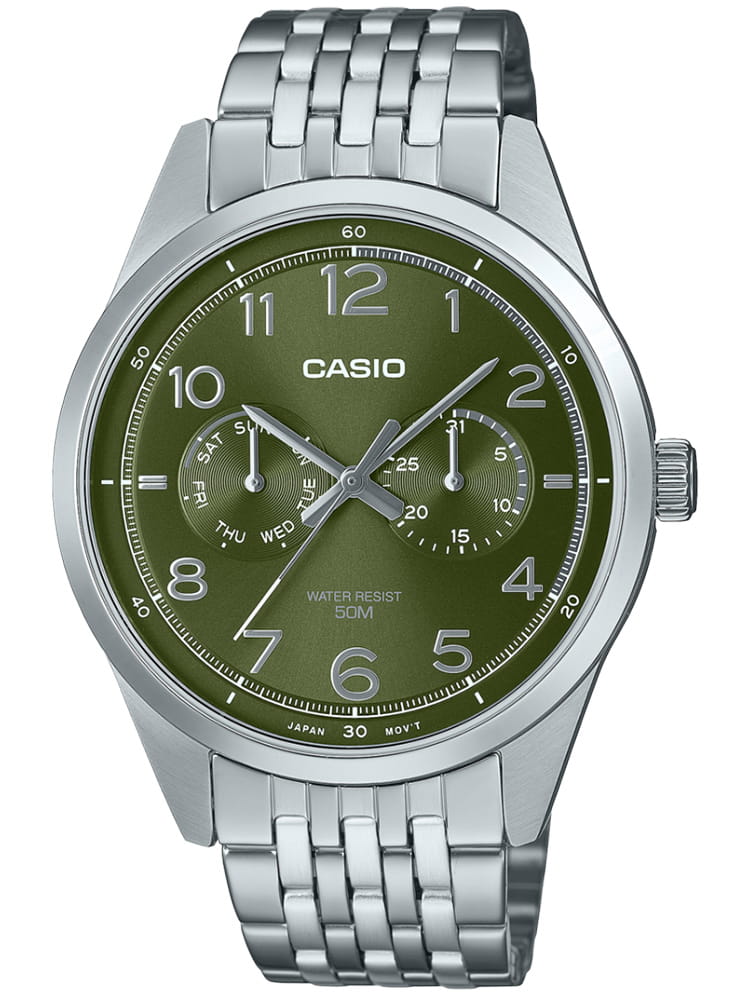 Zegarek męski Casio MTP-E340D-3A to wyjątkowe połączenie klasycznego stylu i nowoczesnej precyzji, które idealnie wpisuje się w potrzeby współczesnego mężczyzny. Jego stalowa koperta w srebrnym odcieniu prezentuje się niezwykle elegancko, a zielona tarcza w subtelnym tonie nadaje mu indywidualnego charakteru. Dzięki dopracowanym detalom i harmonijnemu zestawieniu kolorów, ten zegarek stanowi doskonały wybór zarówno do codziennego noszenia, jak i bardziej formalnych okazji. Elegancki, funkcjonalny i solidny – taki właśnie jest ten model Casio.