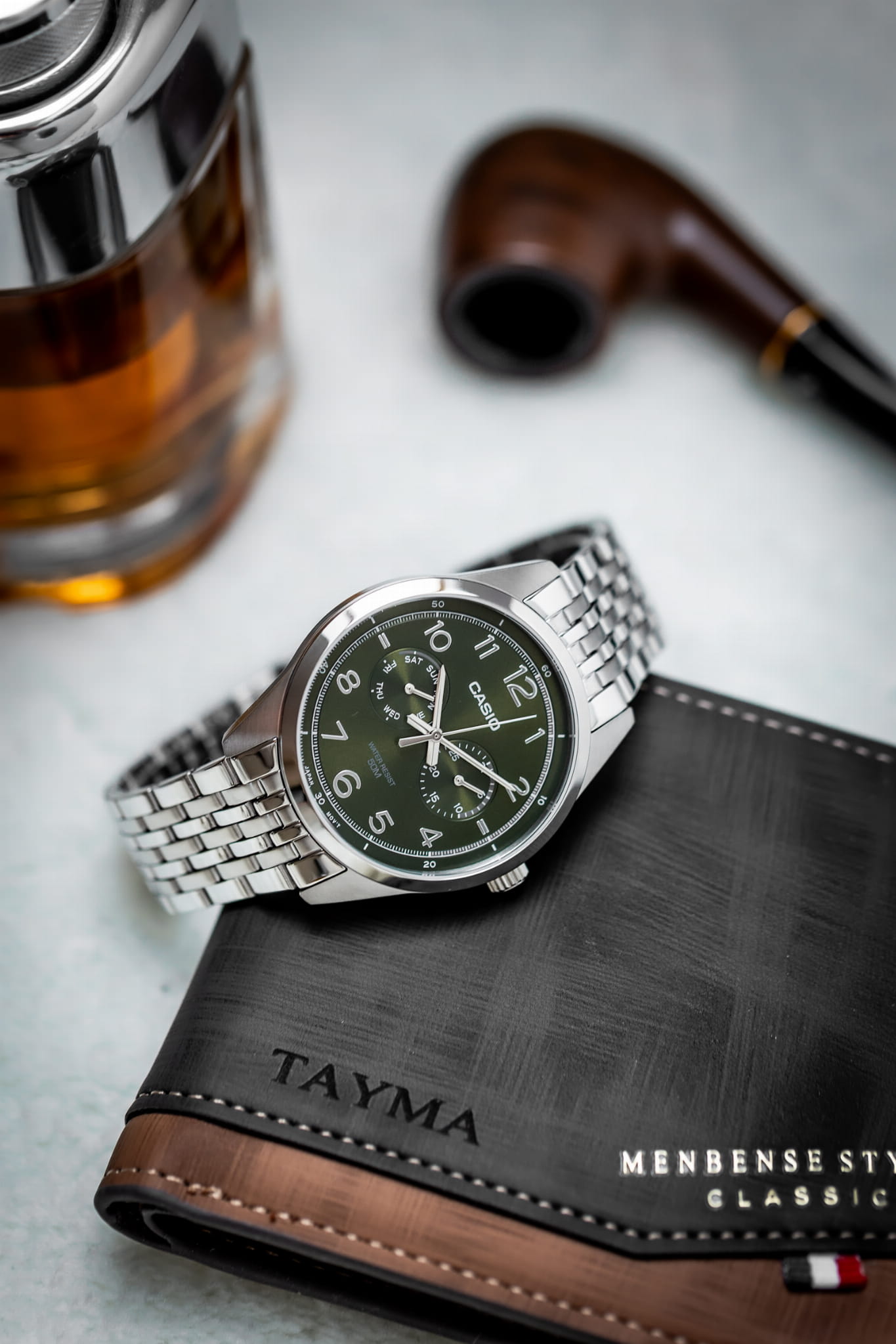 Casio MTP-E340D-3A to propozycja dla mężczyzn, którzy szukają dodatku pasującego do każdej stylizacji. Jego uniwersalny design doskonale komponuje się zarówno z eleganckim garniturem, jak i z casualowym strojem. Zielona tarcza dodaje mu wyjątkowości, podkreślając indywidualny charakter właściciela. Ten zegarek nie tylko odmierza czas, ale również podkreśla styl i pewność siebie – to idealny wybór dla mężczyzn, którzy wiedzą, czego chcą.
