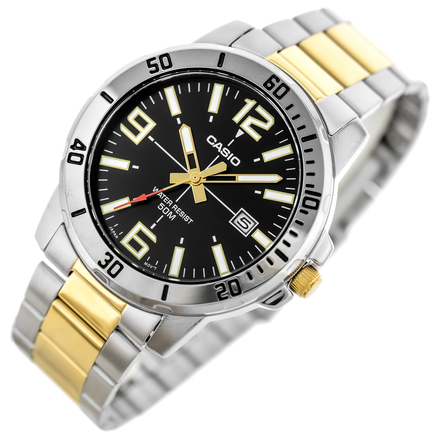 Model MTP-VD01SG-1B został wykonany z najwyższej jakości materiałów, które gwarantują trwałość i wygodę użytkowania. Koperta oraz bransoleta ze stali nierdzewnej są odporne na codzienne użytkowanie, a ich srebrno-złote wykończenie nadaje całości szlachetnego wyglądu. Bransoleta z dopasowanym zapięciem doskonale leży na nadgarstku, zapewniając komfort noszenia przez cały dzień. Dzięki wodoszczelności klasy WR50 zegarek jest odporny na zachlapania i krótkotrwały kontakt z wodą – idealny dla aktywnych mężczyzn, którzy potrzebują stylowego, ale praktycznego dodatku.