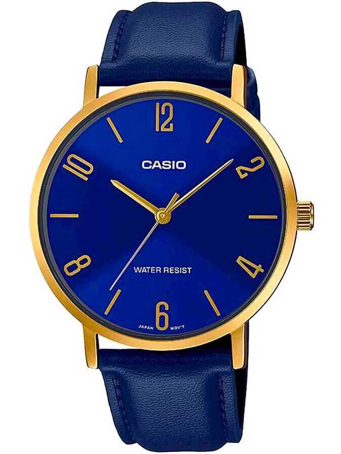 Zegarek męski Casio MTP-VT01GL-2B2 to połączenie elegancji i funkcjonalności, które doskonale wyraża indywidualny styl jego nosiciela. Okrągła tarcza w kolorze granatowym, uzupełniona o złotą kopertę, emanuje klasycznym urokiem i prestiżem.