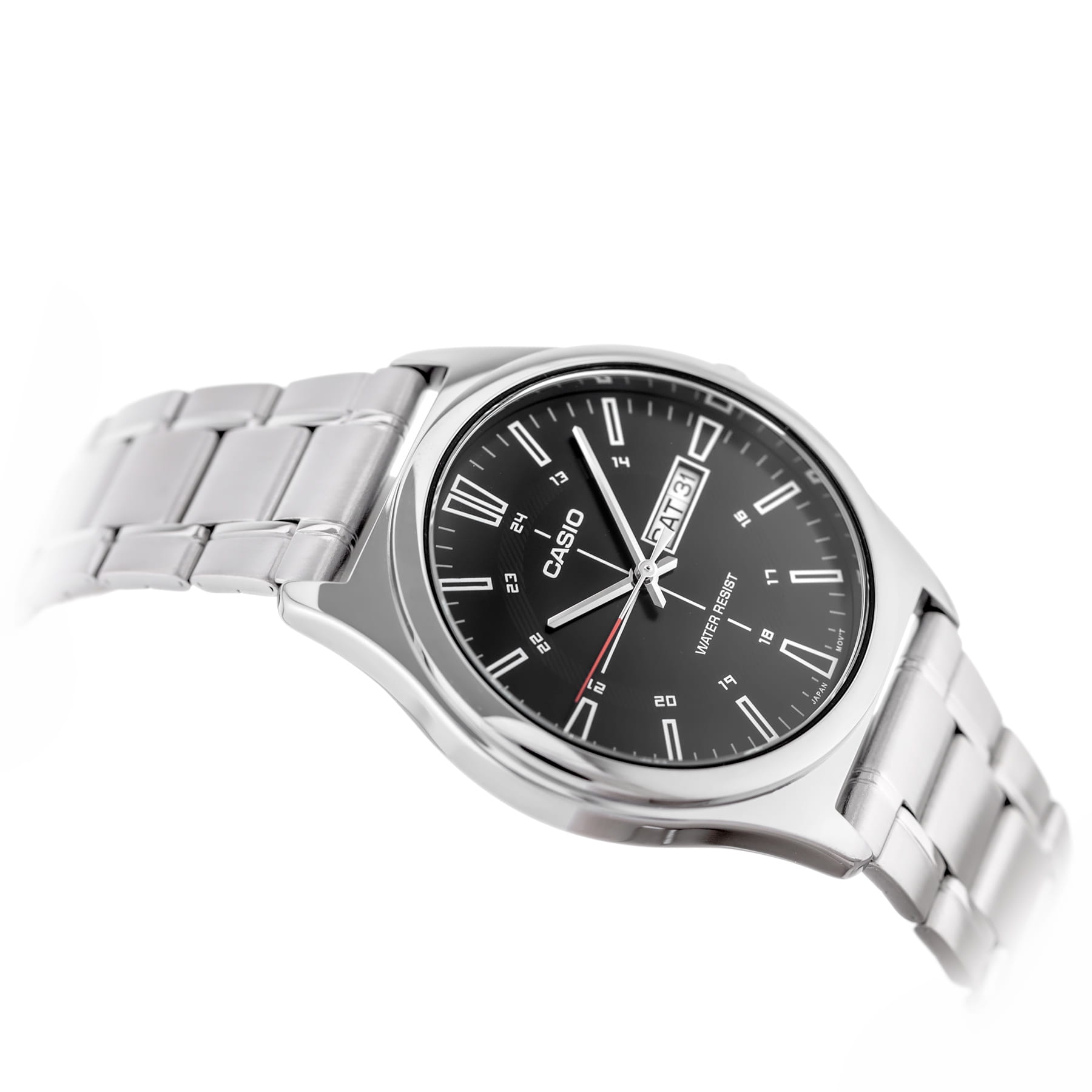 Casio MTP-V006D-1C wyróżnia się eleganckim połączeniem czerni i srebra, które od lat pozostaje synonimem dobrego smaku. Koperta oraz bransoleta wykonane zostały ze stali szlachetnej, gwarantującej trwałość i odporność na zarysowania. Gładka, polerowana powierzchnia koperty kontrastuje z czarną tarczą, tworząc harmonijną i stylową całość. Tarcza zegarka jest wyjątkowo czytelna – dzięki wyraźnym indeksom i subtelnemu datownikowi prezentuje czas w przejrzysty i elegancki sposób. To model, który znakomicie uzupełni zarówno klasyczne, jak i nowoczesne stylizacje.