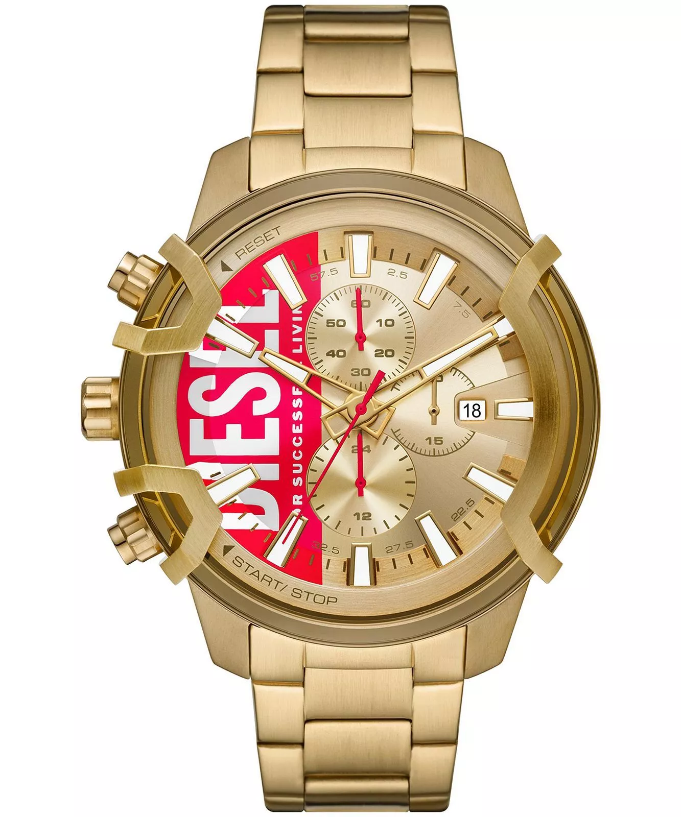 Zegarek męski przyciąga uwagę dużą kopertą o imponującej średnicy 48 mm i grubości 13 mm, która doskonale podkreśla męski nadgarstek i nadaje całości wyrazistego charakteru. Koperta wykonana została z wysokiej jakości stali szlachetnej, a jej jednolite, złote wykończenie tworzy spójną i przyciągającą wzrok całość z tarczą i bransoletą. Dzięki temu model DZ4595 prezentuje się luksusowo i dynamicznie zarazem, wpisując się w estetykę silnych, pewnych siebie mężczyzn.