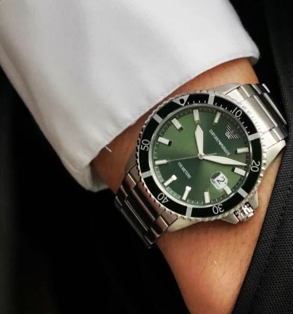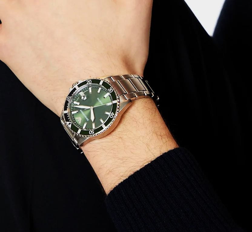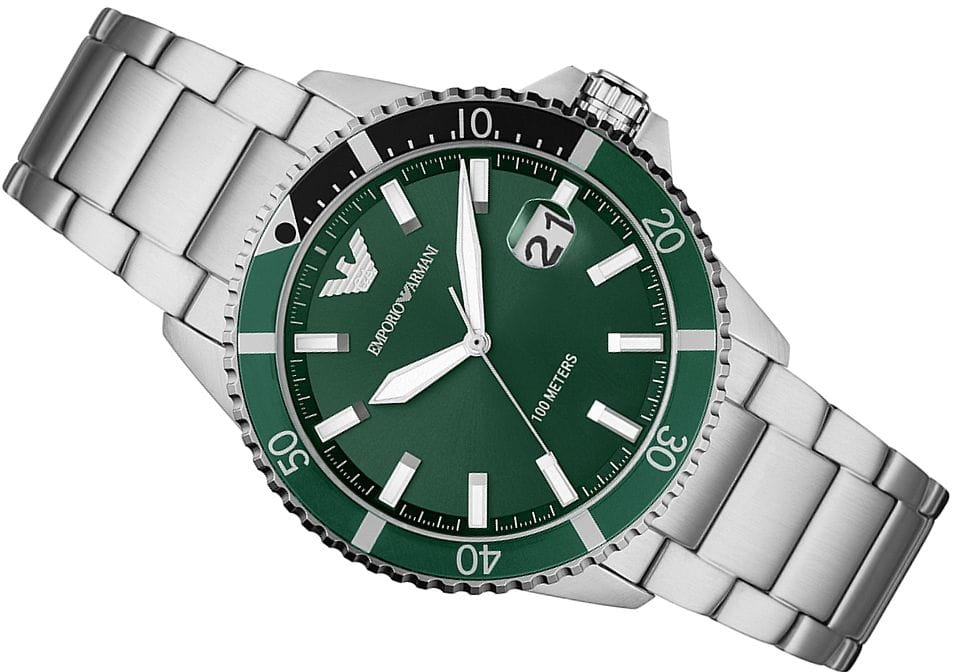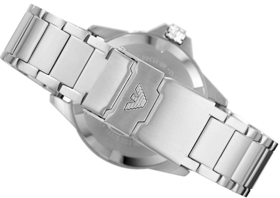 EMPORIO ARMANI AR11338 posiada japoński mechanizm kwarcowy zasilany baterią. Koperta i bransoleta zostały wykonane ze stali szlachetnej 316L, niealergizującej, komfortowej w użytkowaniu. Nowocześnie zaprojektowaną tarczę w ciemnozielonym pokrywa przejrzyste i odporne na pęknięcia szkiełko mineralne.