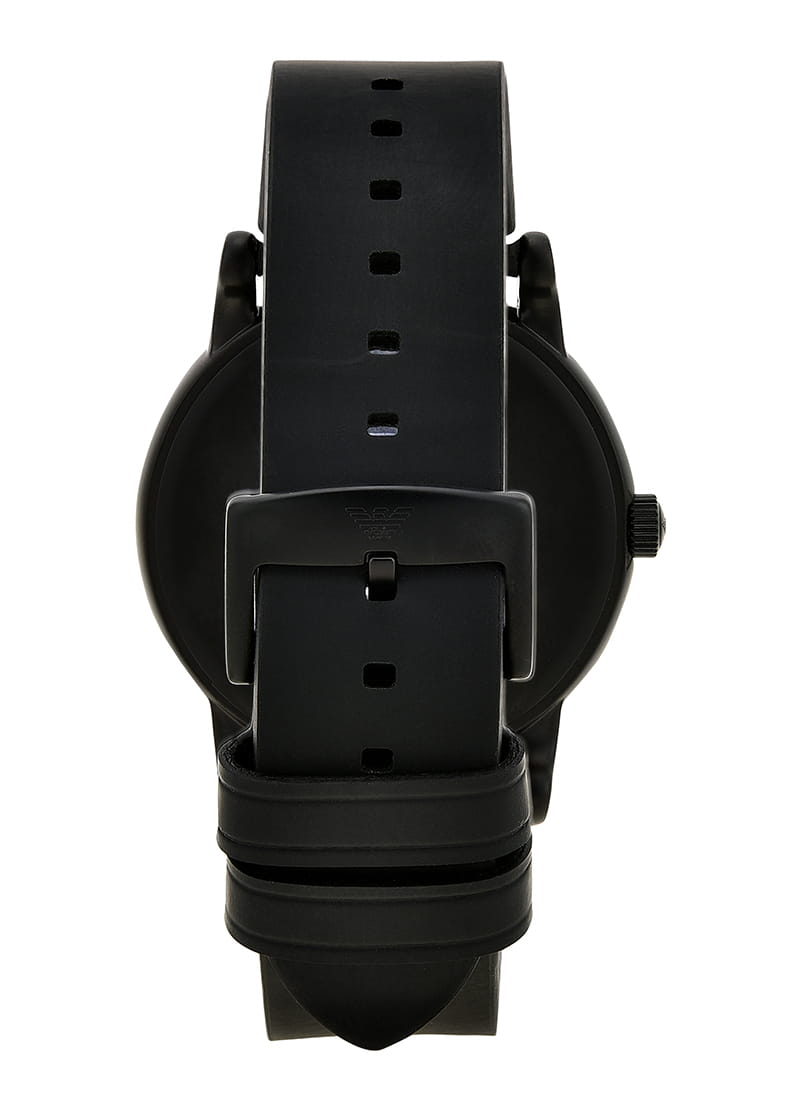 Emporio Armani AR11136 to elegancki, nowoczesny i niezwykle stylowy czasomierz, który doskonale odzwierciedla włoskie podejście do mody i wzornictwa. Został zaprojektowany z myślą o mężczyznach ceniących ponadczasową klasę, subtelny luksus oraz funkcjonalność w codziennym użytkowaniu. Kluczowym elementem wizualnym modelu jest czarna koperta o szerokości 43 mm wykonana z wysokiej jakości stali szlachetnej, której matowe wykończenie harmonizuje z gładką czarną tarczą o minimalistycznym układzie. Wrażenie nowoczesnej elegancji dopełnia smukły skórzany pasek w odcieniu głębokiej czerni, dzięki któremu zegarek świetnie prezentuje się zarówno w formalnych, jak i półformalnych stylizacjach.