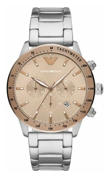 Brązowa, subtelnie rozjaśniana tarcza to element, który przyciąga wzrok swoją głębią i precyzyjnym rozmieszczeniem funkcjonalnych detali. Wyposażona w analogowy datownik, chronograf oraz tachymetr, zapewnia nie tylko elegancję, ale również praktyczne rozwiązania dla mężczyzny aktywnego i dynamicznego. Delikatne akcenty w kolorze beżu oraz subtelnie zaakcentowane sub-tarcze nadają jej wyrafinowanego wyglądu, a logo Emporio Armani na godzinie 12 podkreśla prestiżowy charakter zegarka.
