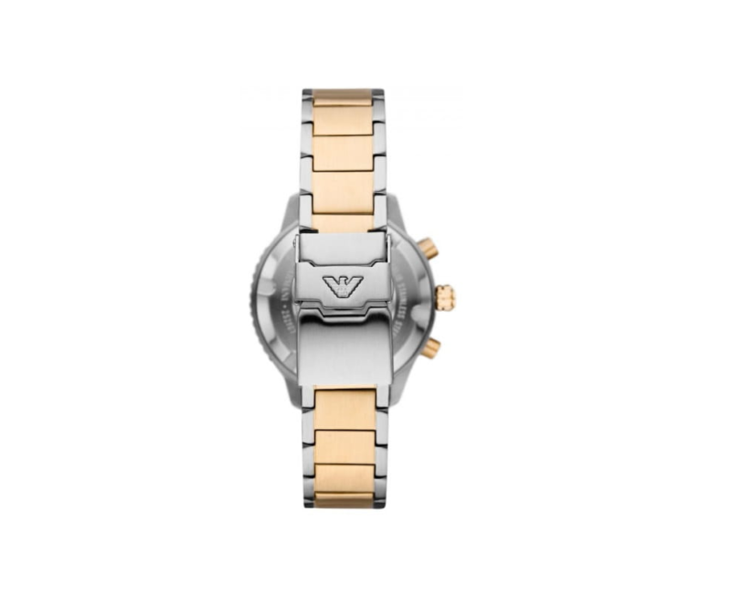 Męski zegarek Emporio Armani AR11361 Diver to elegancki męski zegarek, który został przygotowany z myślą o wszystkich miłośnikach mody i najnowszych stylistycznych trendów. Bransoleta oraz koperta wykonane zostały ze stali szlachetnej, część elementów okrywa powłoka PVD w odcieniu złotym. Ten model zegarka czaruje unikatowym, bardzo charakterystycznym designem ponieważ każdy z elementów jest tu przemyślany i ściśle związany z aspektem funkcjonalnym. Jeśli szukasz zegarka na długie lata, to model ten będzie strzałem w dziesiątkę. Na grafitowej tarczy zabezpieczonej mineralnym szkłem znajdziemy datownik wskazujący dzień miesiąca oraz subtarcze będące wskazaniami chronografu oraz czasu dobowego.