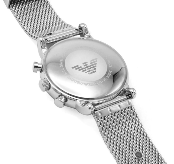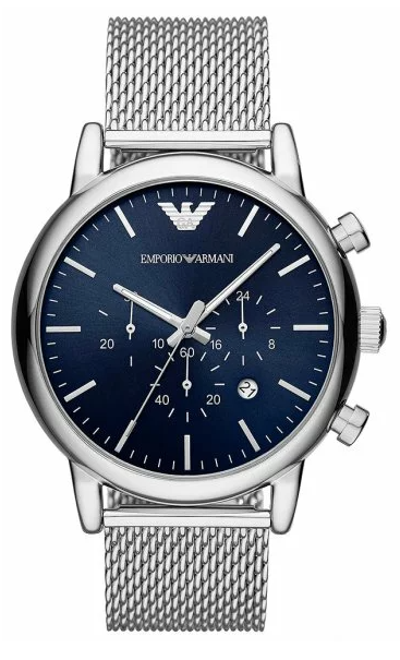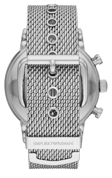 Model Emporio Armani AR80038 wyróżnia się elegancką kompozycją barw – granatowa tarcza doskonale współgra z srebrną kopertą i bransoletą mesh wykonaną z wysokiej jakości stali szlachetnej. Na tarczy umieszczono subtarcze chronografu, wskaźnik czasu 24-godzinnego oraz datownik, które nadają całości dynamicznego, męskiego charakteru. Całość chroni wytrzymałe szkło mineralne, które zabezpiecza cyferblat przed zarysowaniami i uszkodzeniami.
