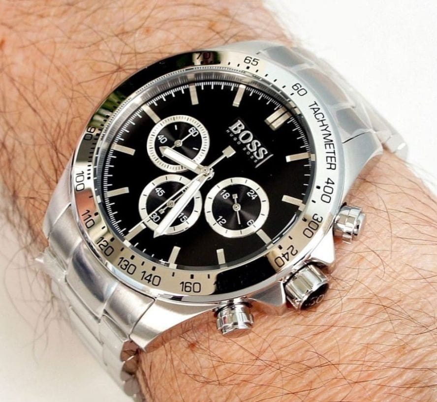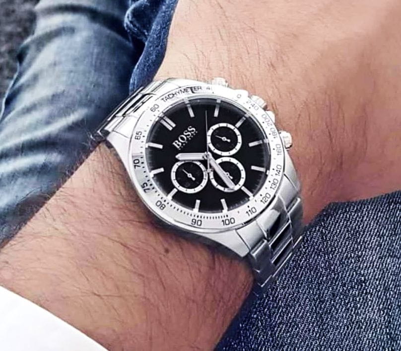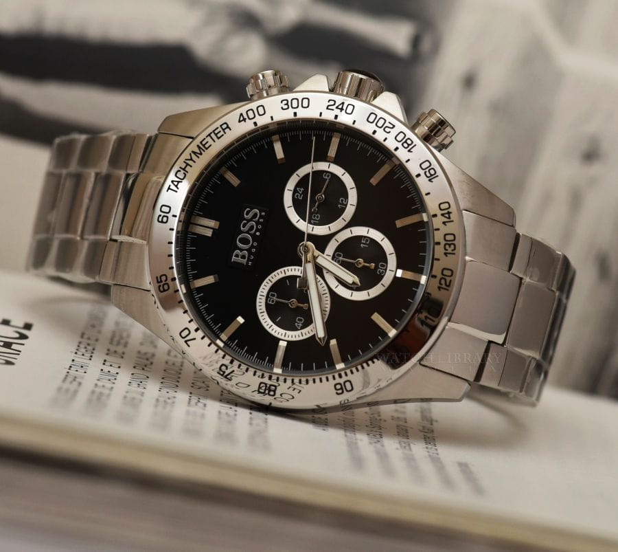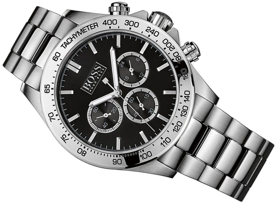 Zegarek męski Hugo Boss Ikon 1512965 napędzany jest za pomocą mechanizmu kwarcowego. Czarną tarczę pokrywa szkiełko mineralne. Do funkcji zegarka możemy zaliczyć stoper w formie chronografu oraz wskaźnik czasu 24-godzinnego. Hugo Boss Ikon 1512965 którego koperta wykonana została z wysokiej jakości stali szlachetnej 316l został zawieszony na stalowej bransolecie. Wodoszczelność na poziomie 10 ATM (100m) sprawia, że z czasomierzem można wchodzić do wody i z nim pływać. Dodatkowo jest wyposażony w zakręcaną koronkę. Zegarek o numerze Ikon 1512965 Chronograph niemieckiego producenta Hugo Boss został zaprojektowany zgodnie z najnowszymi trendami w modzie męskiej.