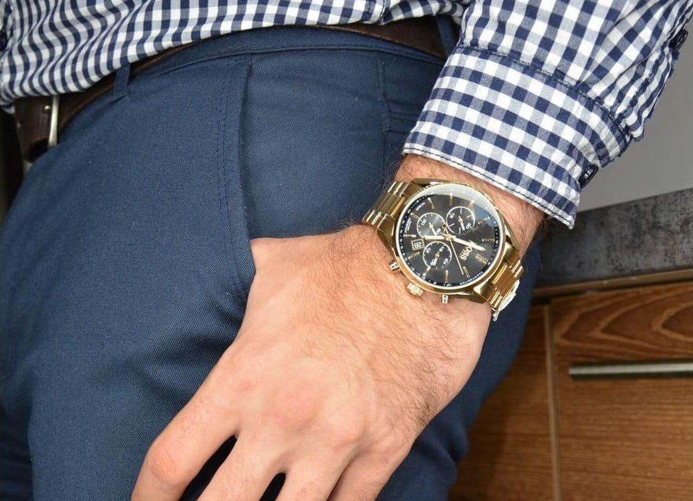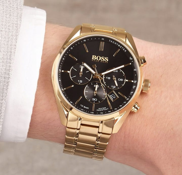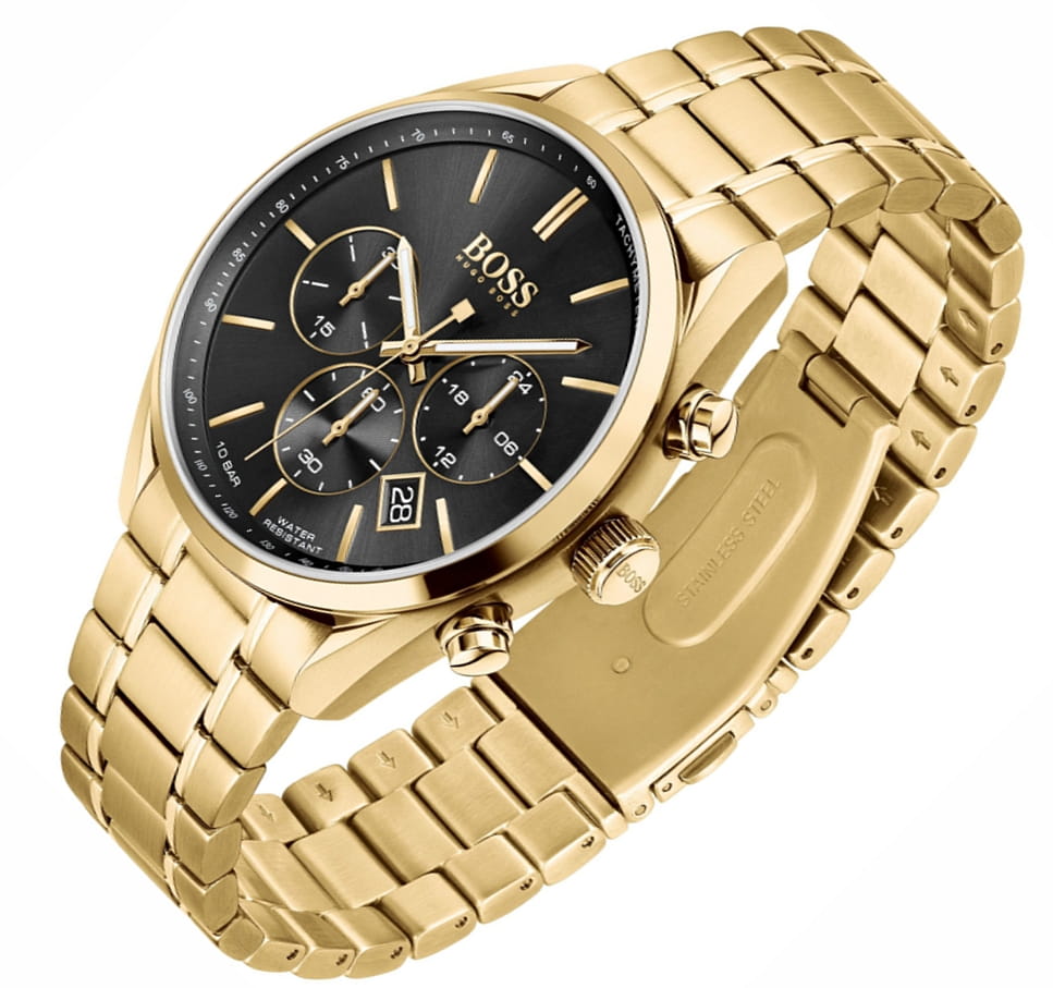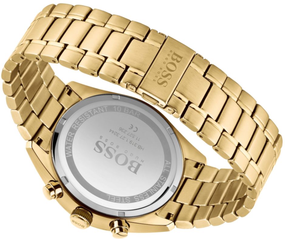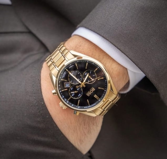 Stylowa czarna tarcza - Czarna tarcza zegarka tworzy elegancki kontrast z złotą kopertą. Wyraźne złote indeksy i wskazówki zapewniają doskonałą czytelność, a logo Hugo Boss podkreśla prestiż marki.