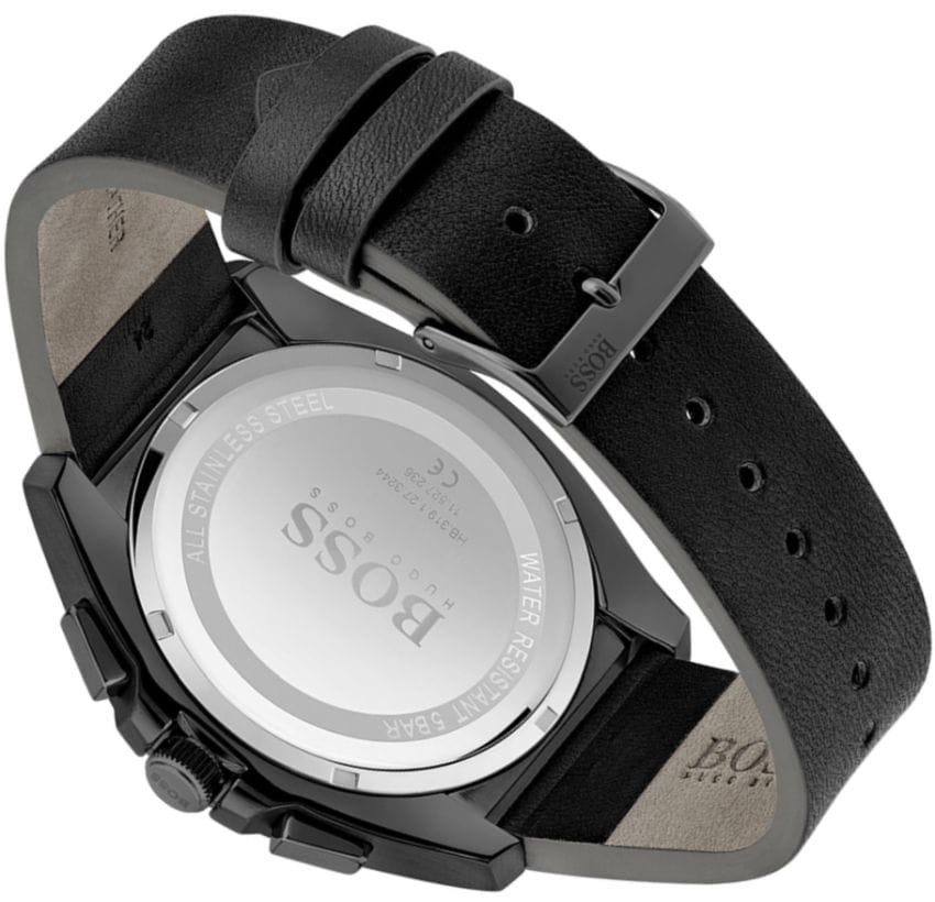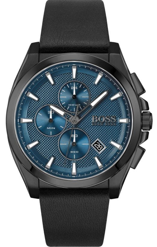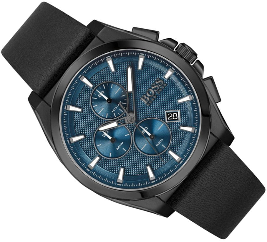 Hugo Boss 1513883 z najnowszej kolekcji Grandmaster z modną, fakturowaną tarczą w niebieskim kolorze. Zasilany przez mechanizm kwarcowy zasilany baterią. Koperta wykonana została ze stali szlachetnej 316L, trwałej i komfortowej w użytkowaniu. Dzięki wbudowanemu analogowemu datownikowi między godzinami 4 i 5-tą jest możliwość sprawdzenia aktualnej daty. Zegarek dodatkowo posiada stoper w formie chronografu, który odmierza czas do 30 minut. Mała sub-tarcza przy godzinie 12-ej wskazuje czas 24-godzinny, czyli aktualną porę dnia. Niebieską tarczę pokrywa przejrzyste szkiełko mineralne. Wodoszczelność na poziomie 5 atm to odporność na zachlapania i krótkotrwałe zanurzenie w wodzie. Dodatkowym atutem jest warstwa neobrite na wskazówkach i indeksach, która po naświetleniu jest widoczna po zmroku. Całość zamyka czarny, gładki pasek wykonany z wysokogatunkowej skóry naturalnej.