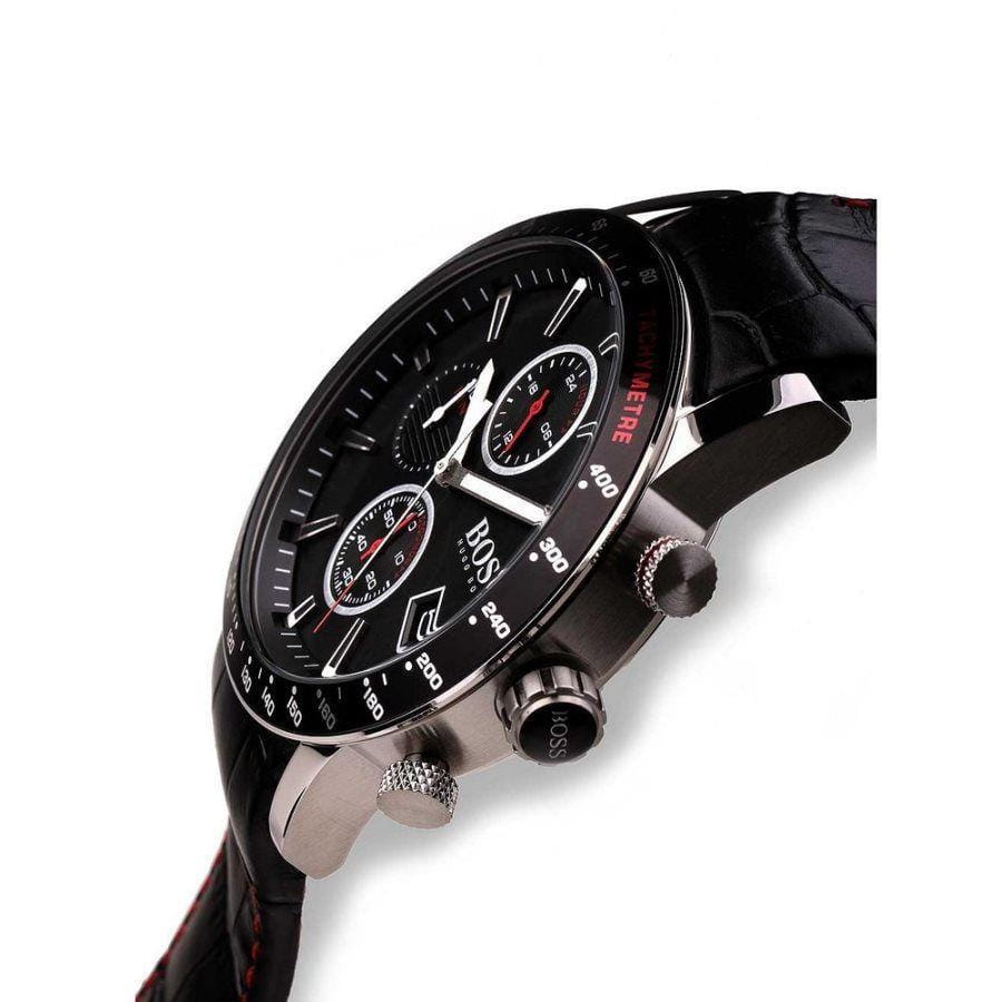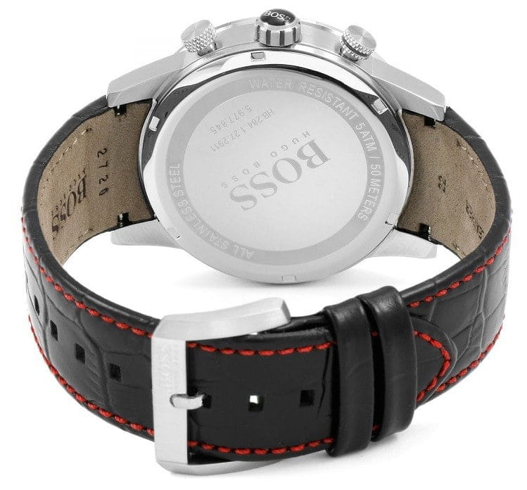 Zegarek męski Hugo Boss 1513390 Rafale to klasyczny męski zegarek na każdą okazję. Na czarnej tarczy zabezpieczonej mineralnym szkłem i otoczonej czarnym pierścieniem z tachymetrem znajdziemy datownik dnia miesiąca oraz subtarcze będące wskazaniami chronografu i czasu dobowego.