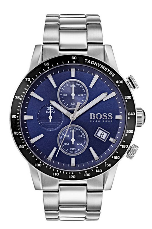 Zegarek męski Hugo Boss 1513510 z serii Rafale to gustowny męski zegarek na każdą okazję. Na granatowej tarczy zabezpieczonej trwałym mineralnym szkłem i otoczonej czarnej pierścieniem znajdziemy datownik dnia miesiąca oraz subtarcze będące wskazaniami chronografu oraz czasu dobowego.