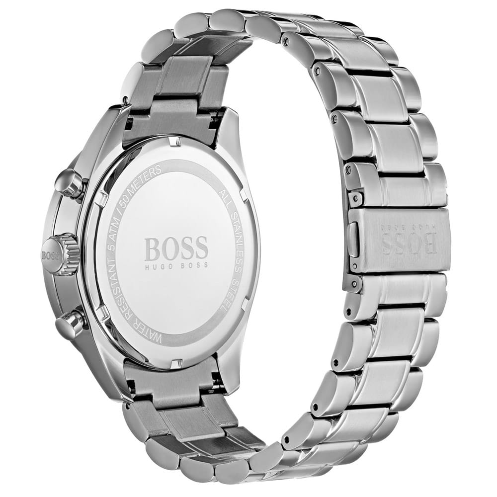 Zegarek męski Hugo Boss 1513630 Trophy to stylowy męski czasomierz, idealny zarówno do eleganckiego ubioru, jak i do uprawiania sportów i codziennych stylizacji. Mechanizm kwarcowy zapewnia precyzyjne odmierzanie czasu. Koperta oraz bransoleta zostały wykonane ze stali szlachetnej co gwarantuje wieloletnią odporność na zniszczenie. Na czytelnej tarczy w kolorze granatowym zabezpieczonej mineralnym szkłem znajdziemy datownik wskazujący dzień miesiąca oraz subtarcze będące wskazaniami chronografu oraz czasu dobowego.. Klasa wodoszczelności czasomierza to WR50, co gwarantuje szczelność zegarka w przypadku drobnych zachlapań.