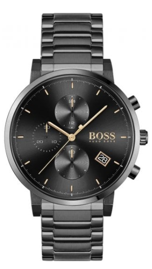 Zegarek męski Hugo Boss 1513780 Integrity to elegancki męski zegarek idealny zarówno do eleganckiego ubioru, jak i do noszenia na co dzień. Na czarnej tarczy zabezpieczonej mineralnym szkłem i otoczonej czarnym pierścieniem znajdziemy datownik dnia miesiąca oraz subtarcze będące wskazaniami chronografu i czasu dobowego.