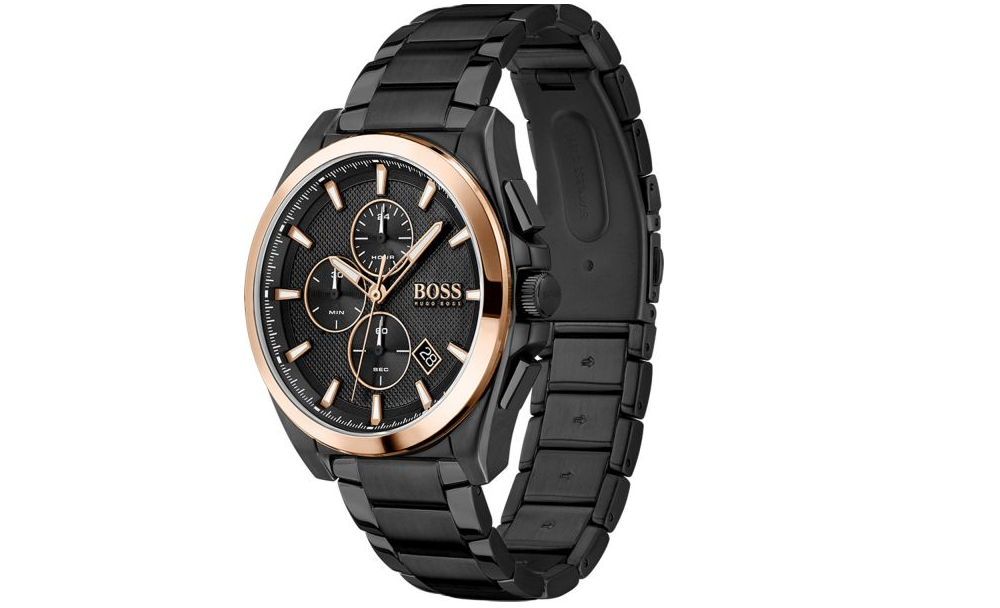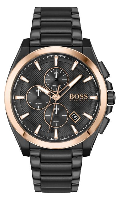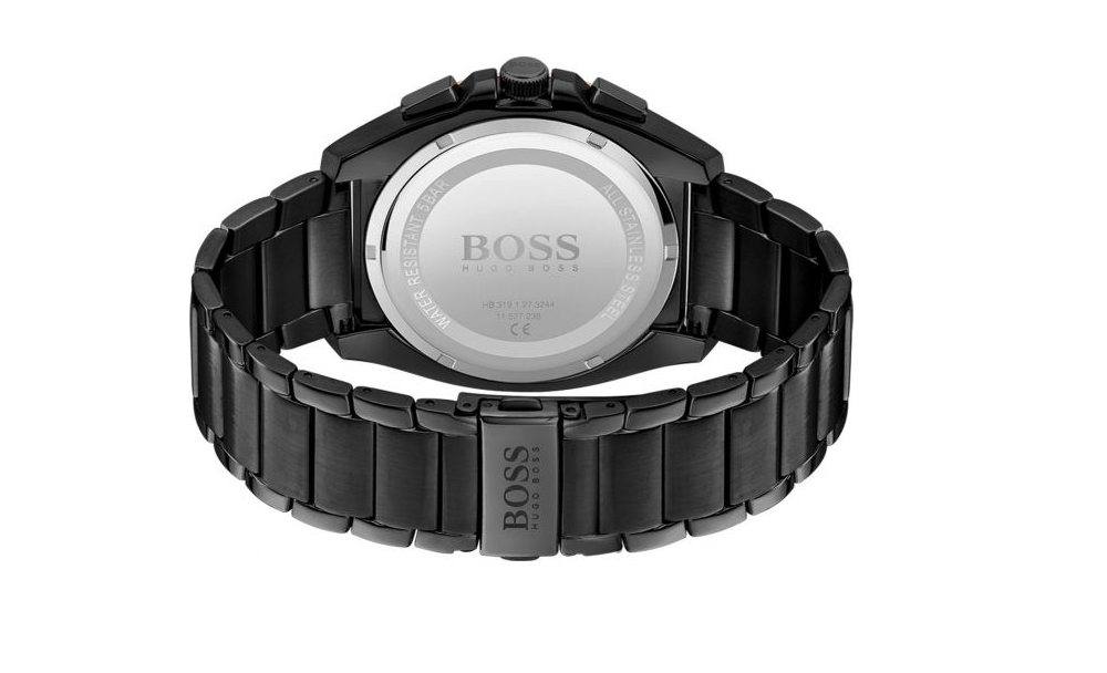 Zegarek męski Hugo Boss 1513885 Grandmaster to propozycja dla mężczyzn, którzy szukają funkcjonalnego i jednocześnie eleganckiego zegarka. Model tego zegarka posiada czarną bransoletę oraz kopertę - obie wykonane ze stali szlachetnej. Na czarnej mocno rozbudowanej tarczy zabezpieczonej mineralnym szkłem znajdziemy datownik wskazujący dzień miesiąca oraz subtarcze będące wskazaniami chronografu oraz czasu dobowego oraz stoper, który obsługuje się za pomocą bocznych przycisków. Wodoszczelność na poziomie 5ATM dzięki czemu z zegarkiem można się kąpać, ale nie wolno w nim pływać. Największy atut tego modelu to wielkość koperty, wspaniale prezentuje się na męski nadgarstku.
