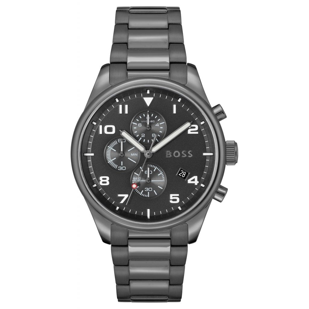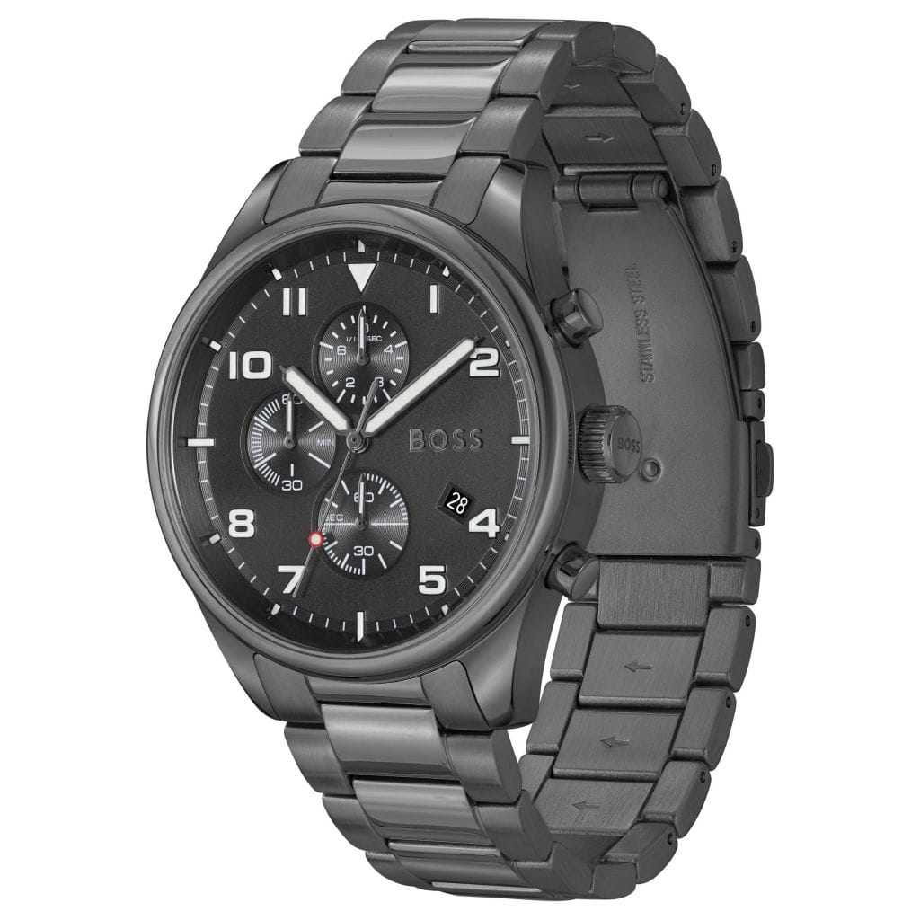 Subtelne indeksy godzinowe oraz logo Hugo Boss dodają prestiżu i ekskluzywności.