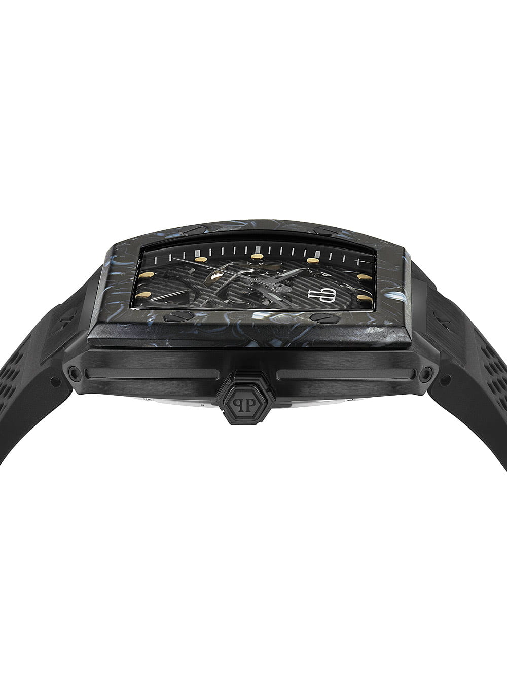 Philipp Plein PWBAA0221 to propozycja dla mężczyzn, którzy cenią odważny, nowoczesny styl i najwyższą jakość wykonania. Marka Philipp Plein jest znana z dynamicznego designu, który łączy luksus z wyrazistym, sportowym charakterem. Ten model wyróżnia się monochromatyczną, głęboką czernią i masywną sylwetką, która doskonale komponuje się zarówno z casualowymi, jak i bardziej eleganckimi stylizacjami. To dodatek dla pewnych siebie mężczyzn, którzy chcą podkreślić swoją osobowość i indywidualny styl.