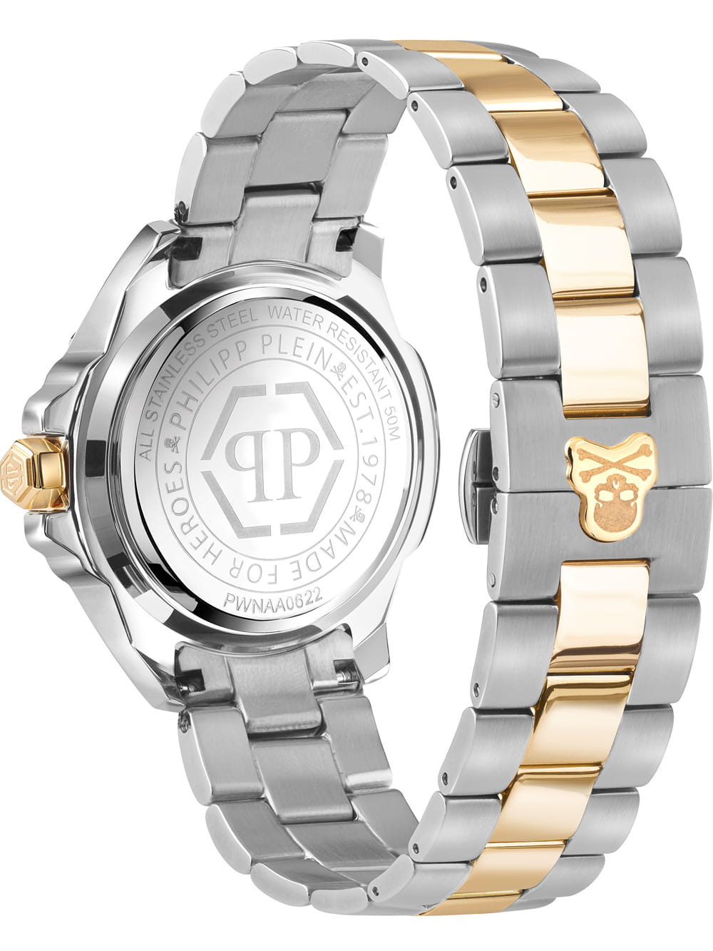 Philipp Plein PWNAA0622 The Skull został wyposażony w precyzyjny mechanizm kwarcowy, który zapewnia niezawodne odmierzanie czasu i wysoką dokładność wskazań. Jego konstrukcja minimalizuje konieczność regulacji, co sprawia, że jest niezwykle wygodny w codziennym użytkowaniu. Wodoszczelność na poziomie 5 ATM (50 metrów) gwarantuje ochronę przed zachlapaniami, co czyni model odpornym na codzienne wyzwania i różne warunki atmosferyczne.