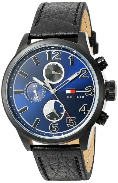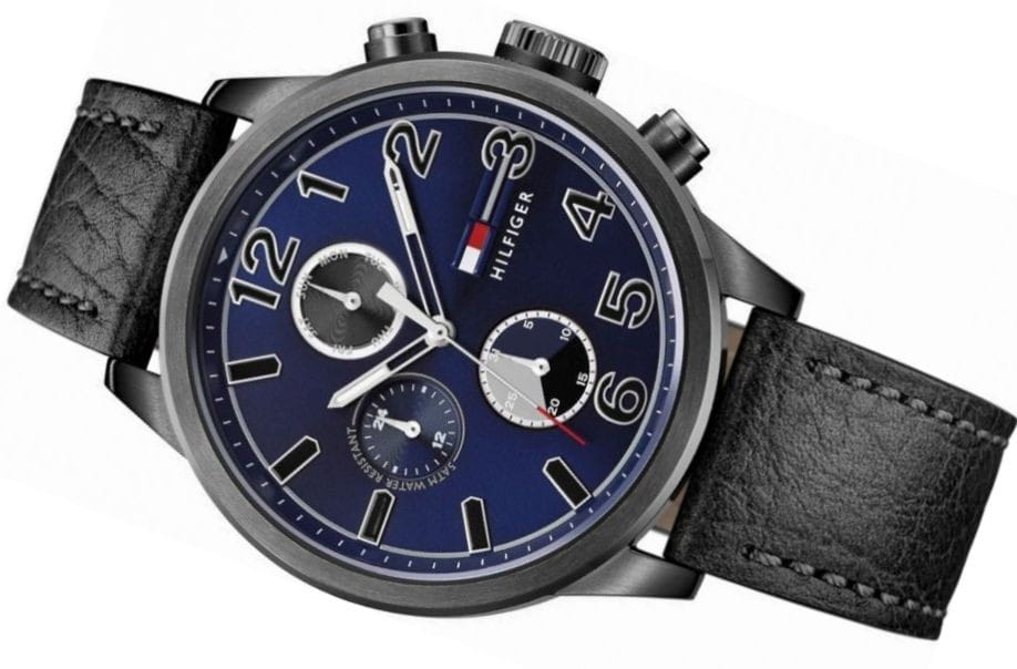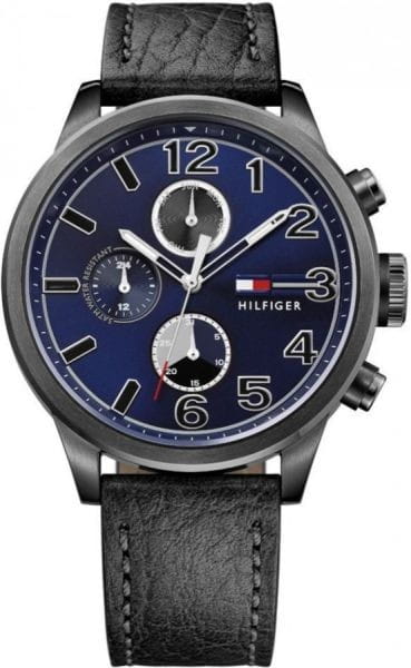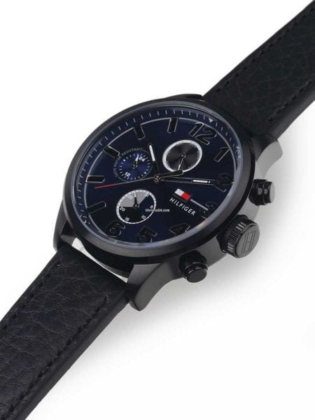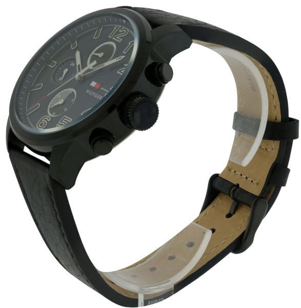 Zegarek męski TOMMY HILGIFER o numerze seryjnym 1791241 jest napędzany przez mechanizm kwarcowy, który umieszczono w kopercie wykonanej ze stali szlachetnej. Na granatowej tarczy znajdują się dwa datowniki odpowiedzialne za pokazywanie aktualnego dnia tygodnia i miesiąca. Dodatkowo obok godziny 9 umiejscowiona jest mała tarcza czasu 24-godzinnego. Wodoszczelność na poziomie 5 ATM (50m) sprawia, że z czasomierzem można wchodzić do wody, ale nie zaleca się nurkowania na większe głębokości. Zegarek pokryty jest odpornym na stłuczenia mineralnym szkiełkiem. Całość utrzymana jest na skórzanym pasku.