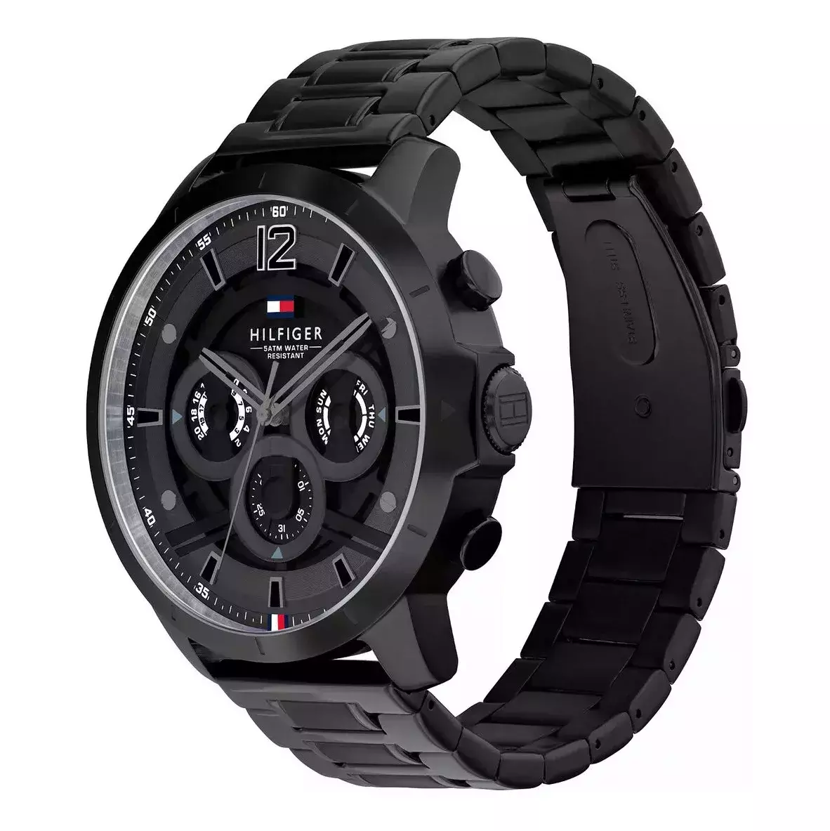 Czarna tarcza została wyposażona w funkcjonalne subtarcze czasu 24h, datownika dni tygodnia oraz datownika dni miesiąca.