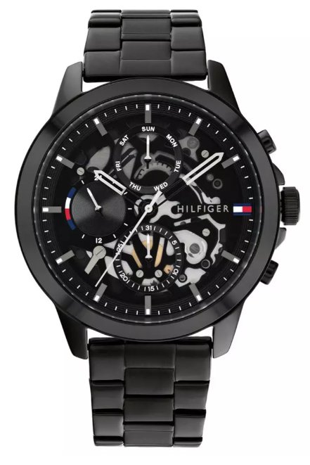 Koperta o średnicy 44 mm została wykonana z wysokiej jakości stali szlachetnej, co gwarantuje trwałość i odporność na codzienne użytkowanie. Jej czarne wykończenie dodaje wyrazistości, a subtelnie zintegrowane przyciski i koronka zachowują spójność designu. Analogowy odczyt na eleganckiej, czarnej tarczy zapewnia czytelność, a minimalistyczne indeksy i wskazówki doskonale komponują się z logo marki Tommy Hilfiger umieszczonym na cyferblacie.