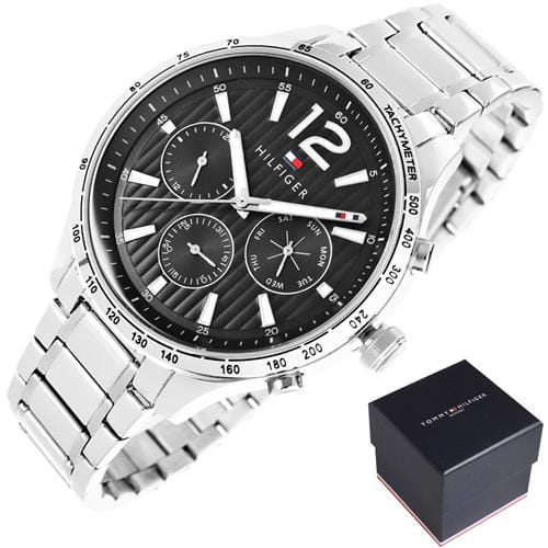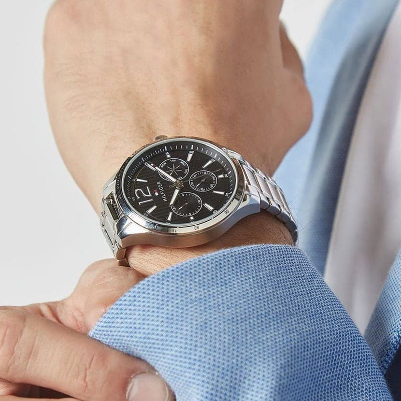 Zegarek męski Tommy Hilfiger 1791469 to modowy model w stylu casual, który pasuje do wielu stylizacji. Koperta oraz bransoleta w kolorze srebrnym wykonana z mocnej stali szlachetnej jest odporna na korozję. Szkło mineralne na tarczy jest bardzo odporne na stłuczenia i zarysowania. Tarcza została wyposażona w funkcjonalne tarcze czasu 24h, datownika dni tygodnia oraz datownika dni miesiąca. Wodoszczelność zegarka jest na poziomie 5 ATM, można z nim się bezpiecznie kąpać.