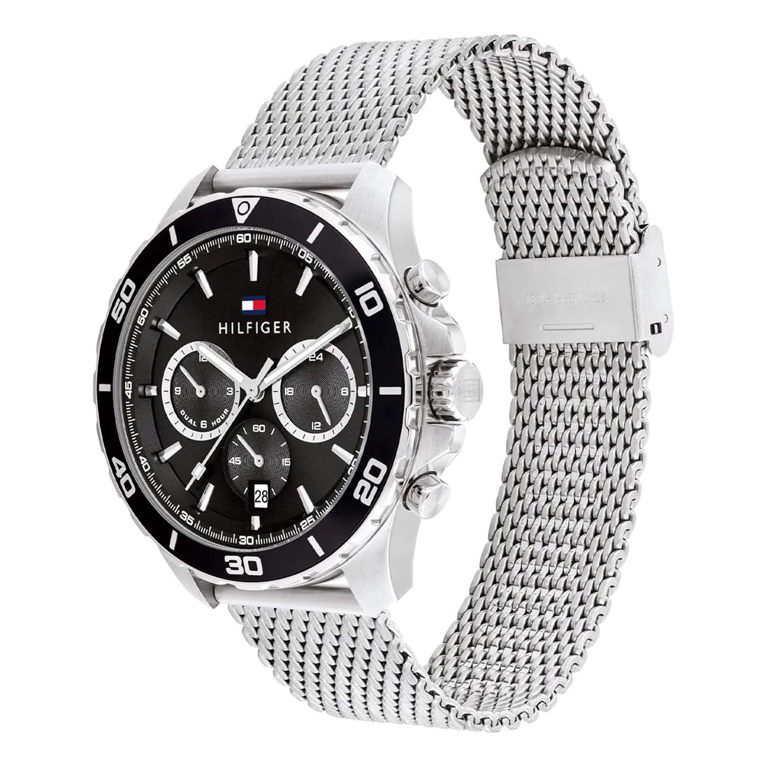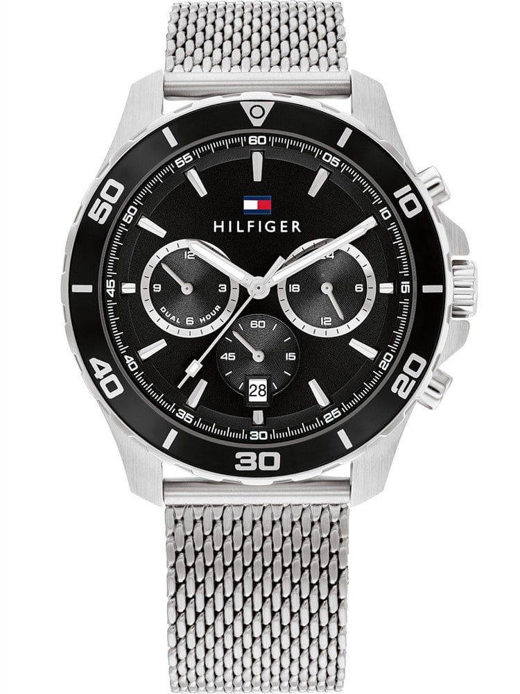 Czarna tarcza stanowi kontrastowe tło dla jasnych indeksów i wskazówek, zapewniając bardzo dobrą czytelność w każdych warunkach. Prosty, przejrzysty układ ułatwia szybki odczyt czasu, a subtelne logo marki Tommy Hilfiger umieszczone na wysokości godziny trzeciej dodaje całości rozpoznawalnego charakteru. Całość została zamknięta w okrągłej kopercie wykonanej z odpornej stali szlachetnej, której średnica wynosi 43 mm, a grubość 11 mm – proporcje idealne dla większości męskich nadgarstków, zapewniające jednocześnie mocny, ale nieprzytłaczający wygląd.